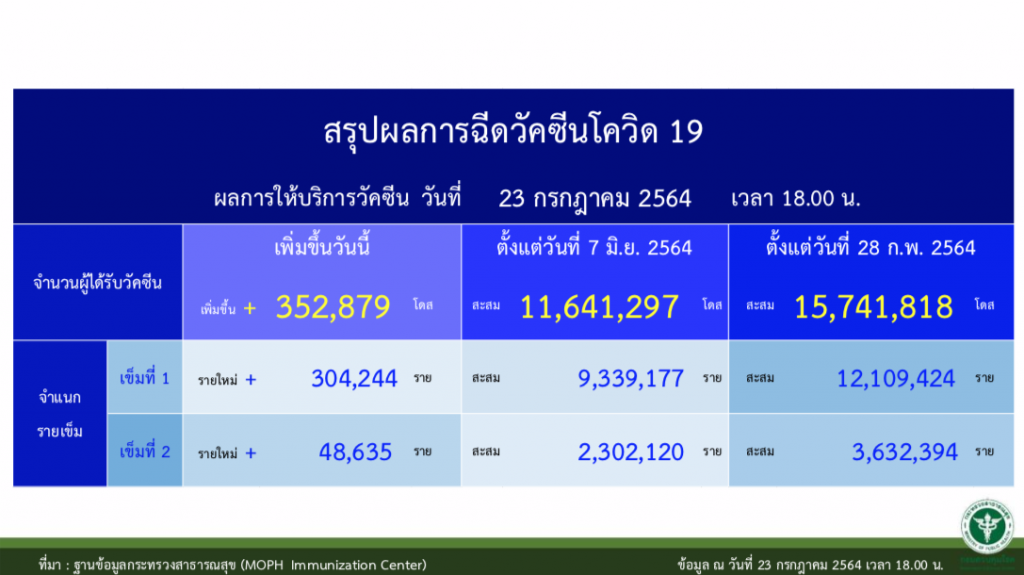 สำหรับการฉีดวัคซีนเข็มที่ 1 มีผู้ได้รับแล้วเพิ่มขึ้น 304,244 คน รวมสะสม 12,109,424 คน และมีผู้ได้รับวัคซีนครบ 2 เข็มแล้ว เพิ่มขึ้น 48,635 คน รวมสะสม 3,632,394 คนรวมสะสม15,741,818 โดส .-สำนักข่าวไทย