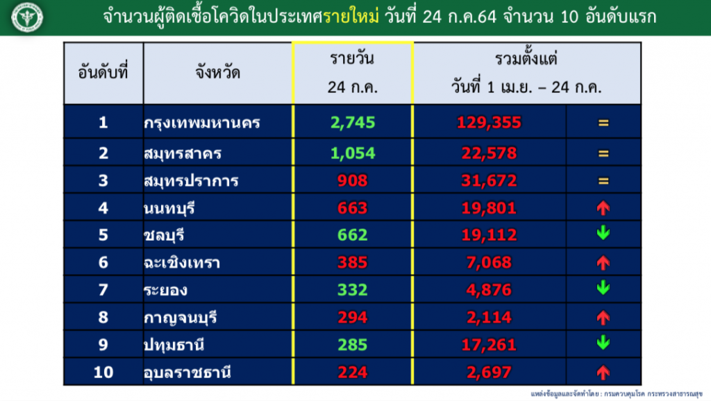 สำหรับจำนวนผู้ติดเชื้อรายวัน 10 อันดับแรก ได้แก่ กทม. 2,745 ราย สมุทรสาคร 1,054 รายสมุทรปราการ 908 ราย นนทบุรี 663 ราย ชลบุรี 662 ราย ฉะเชิงเทรา 385 ราย ระยอง 332 รายกาญจนบุรี 294 ราย ปทุมธานี 285 ราย และอุบลราชธานี 224 ราย