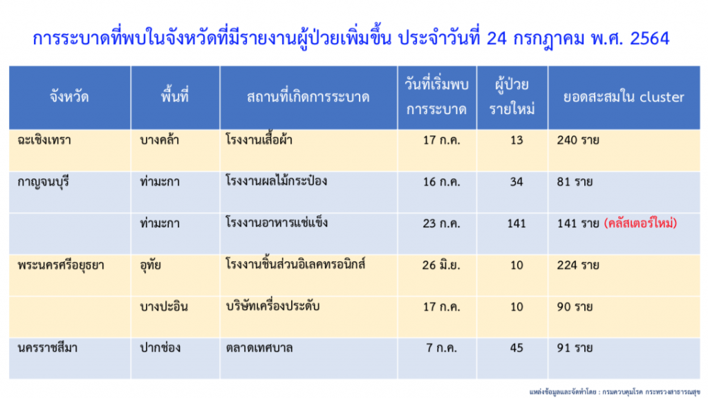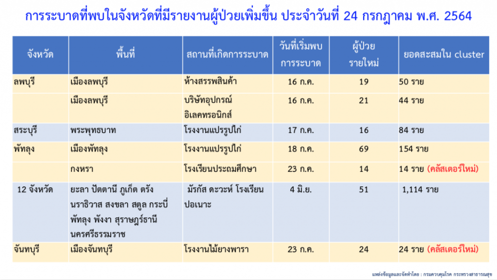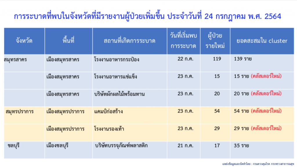 ส่วนคลัสเตอร์ใหม่พบกระจายในหลายจังหวัด ได้แก่ อ.เมือง จ.สมุทรสาคร พบ 2 คลัสเตอร์ ในโรงงานอาหารแช่แข็ง 15 ราย และบริษัทผักผลไม้พร้อมทาน 20 ราย อ.เมือง จ.สมุทรปราการ พบ 2 คลัสเตอร์ ในแคมป์ก่อสร้าง 54 ราย และโรงงานรองเท้า 29 ราย อ.ท่ามะกา จ.กาญจนบุรี พบผู้ติดเชื้อที่โรงงานอาหารแช่แข็ง 141 ราย อ.กงหรา จ.พัทลุง พบในโรงเรียนประถมศึกษา 14 ราย อ.เมือง จ.จันทบุรี พบในโรงงานไม้ยางพารา 24 ราย