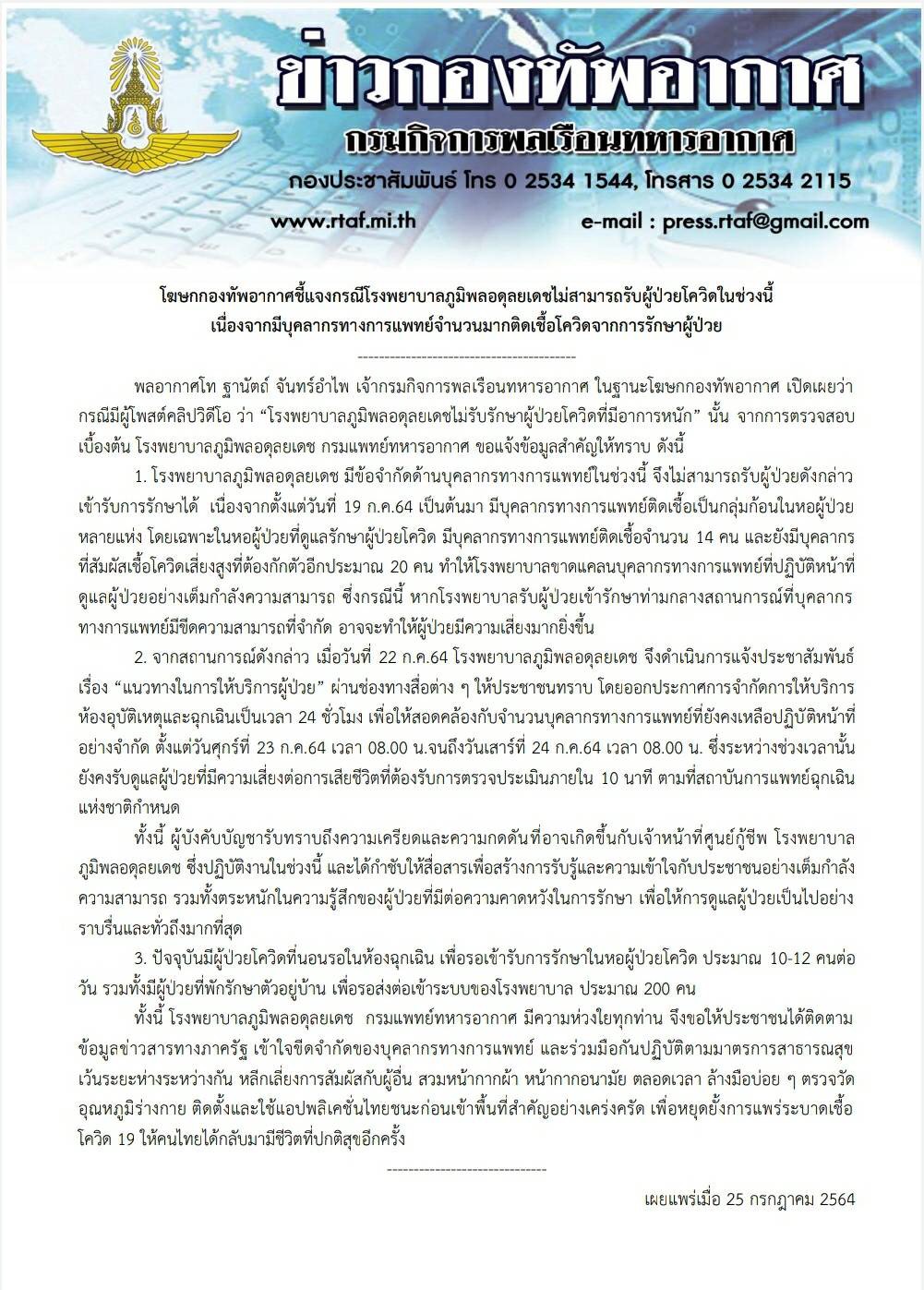 กรุงเทพฯ 25 ก.ค. – โฆษกกองทัพอากาศ ชี้แจงกรณีโรงพยาบาลภูมิพลอดุลยเดช ไม่สามารถรับผู้ป่วยโควิดในช่วงนี้ เนื่องจากมีบุคลากรทางการแพทย์จำนวนมากติดเชื้อโควิดจากการรักษาผู้ป่วย