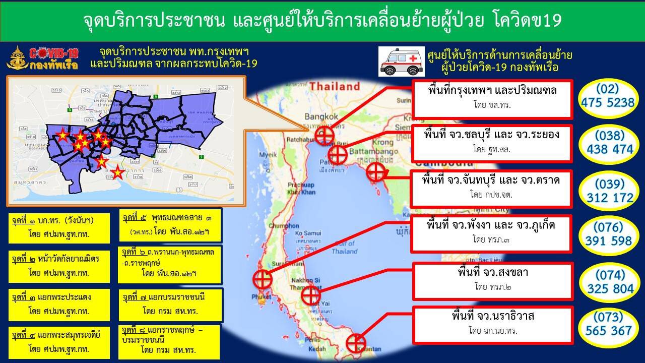 ผู้สื่อข่าวรายงานว่า เพื่อสนับสนุนในการเคลื่อนย้าย กองทัพเรือจัดตั้งศูนย์บริการด้านการเคลื่อนย้ายผู้ป่วยโควิด-19 ประจำพื้นที่รับผิดชอบของกองทัพเรือ โดยในเขตพื้นที่กรุงเทพฯ และปริมณฑล สามารถใช้บริการได้ที่หมายเลขโทรศัพท์ 0 2475 5238 ตลอด 24 ชั่วโมง
