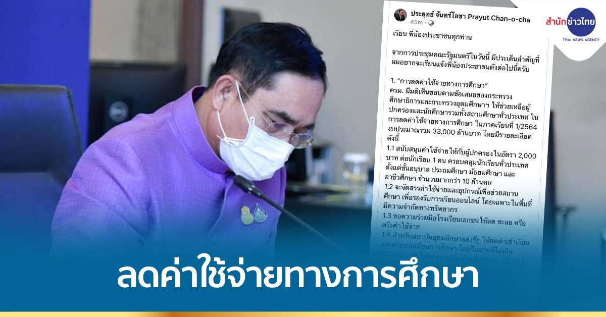 ครม. มีมติเห็นชอบตามข้อเสนอของกระทรวงศึกษาธิการและกระทรวงอุดมศึกษาฯ ให้ช่วยเหลือผู้ปกครองและนักศึกษารวมทั้งสถานศึกษาทั่วประเทศ ในการลดค่าใช้จ่ายทางการศึกษา ในภาคเรียนที่ 1/2564 งบประมาณรวม 33,000 ล้านบาท โดยมีรายละเอียดดังนี้