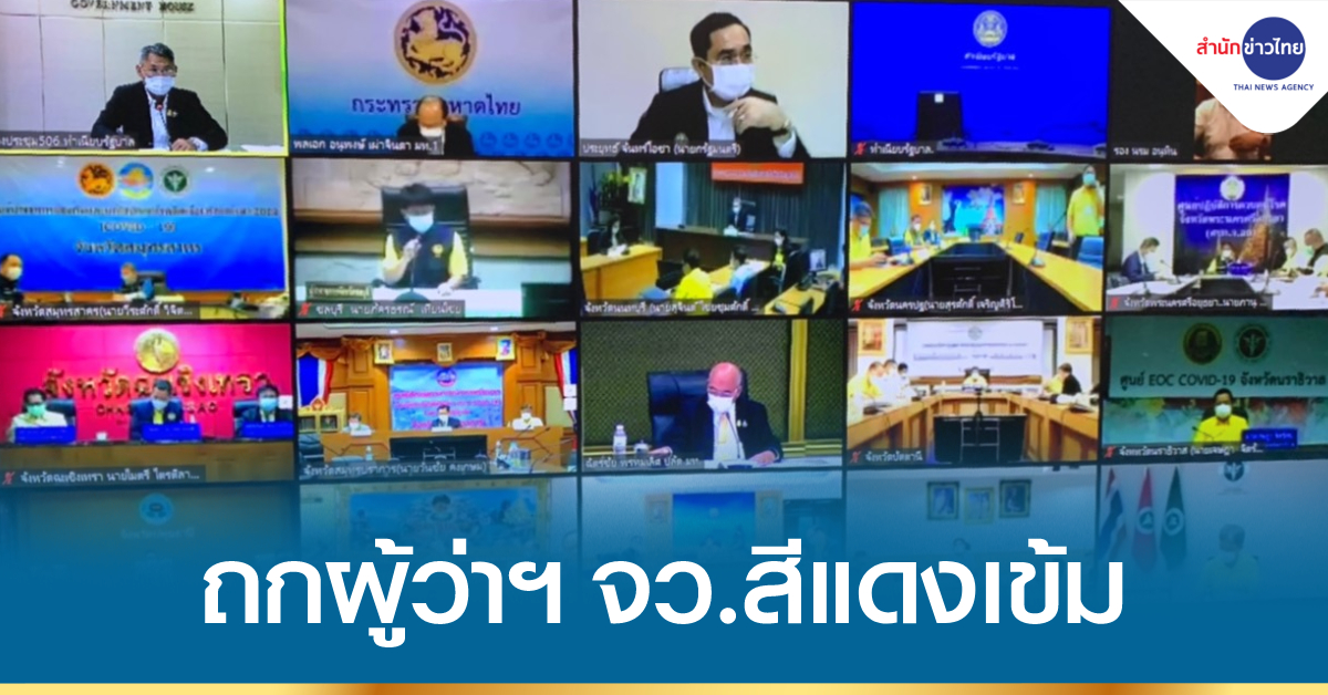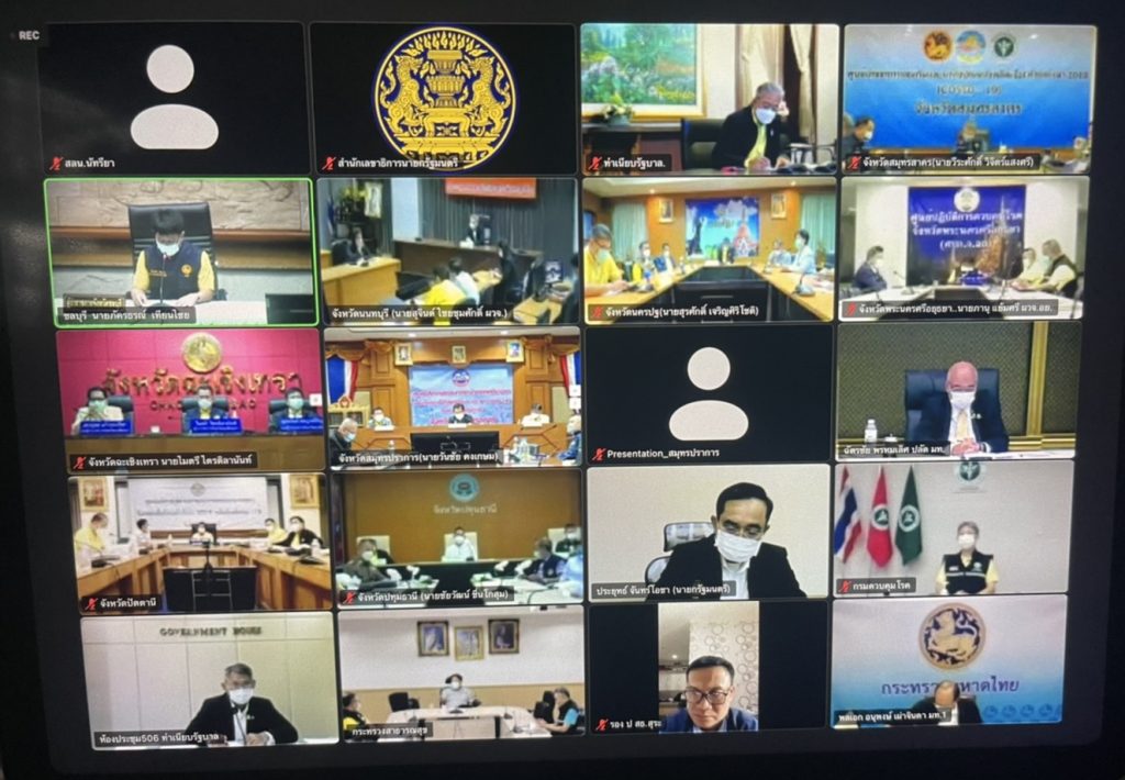 พล.อ.ประยุทธ์ จันทร์โอชา นายกรัฐมนตรี พร้อมด้วยนายอนุทิน ชาญวีรกูล รองนายกรัฐมนตรีและรัฐมนตรีว่าการกระทรวงสาธารณสุข และ พล.อ.อนุพงษ์ เผ่าจินดา รัฐมนตรีว่าการกระทรวงมหาดไทย ประชุมร่วมผู้ว่าราชการจังหวัดสีแดงเข้ม 12 จังหวัด ยกเว้นกรุงเทพฯ ที่ประชุมก่อนหน้านี้ โดยเป็นการประชุมผ่านระบบ Zoom จากบ้านพัก ภายในกรมทหารราบที่ 1 มหาดเล็กราชวัลลภรักษาพระองค์ (ร.1 ทม.รอ.) เพื่อหารือถึงแนวทางการรับมือกับการแพร่ระบาด การให้ความช่วยเหลือผู้ป่วย การตั้งโรงพยาบาลสนามต่างๆ รวมทั้งการสื่อสารทำความเข้าใจกับประชาชน