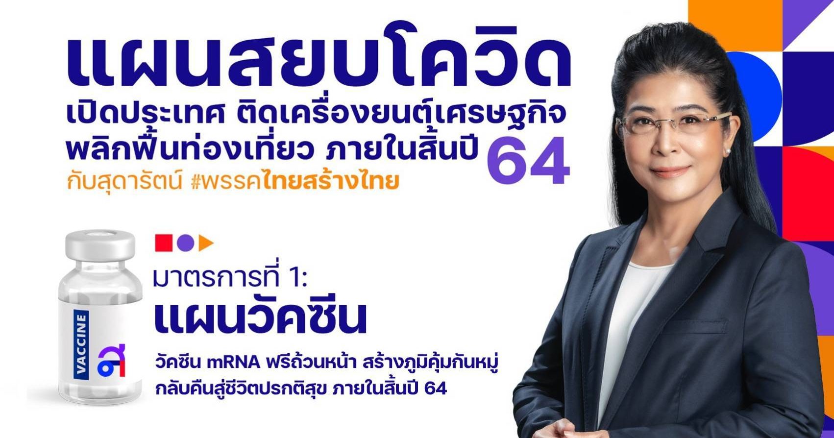 คุณหญิงสุดารัตน์ เกยุราพันธุ์ ประธานพรรคไทยสร้างไทย โพสต์เฟซบุ๊ก ระบุว่า จะต้องไม่ปล่อยให้คนไทยตายเป็นใบไม้ร่วงและต้องจมกับกองทุกข์ทั้งโรคระบาด และเศรษฐกิจที่หายนะอีกต่อไป พรรคไทยสร้างไทยจึงเสนอพิมพ์เขียว เพื่อให้รัฐบาลเร่งปรับแผนวัคซีน โดยต้องสั่ง mRNA อย่างน้อย 100 ล้านโดสเป็นวัคซีนหลักคู่กับ AstraZeneca พร้อมฉีดให้ได้วันละ500,000 โดส เพื่อให้ประชาชน 50 ล้านคนฉีดวัคซีนภายในสิ้นปีนี้ เพื่อเปิดเมือง เปิดประเทศ เปิดการทำมาค้าขาย เร่งฟื้นฟูเศรษฐกิจ เป็นของขวัญปีใหม่ให้คนไทย และที่สำคัญคือทำให้เกิดภูมิคุ้มกันหมู่ได้จริง ได้เร็ว