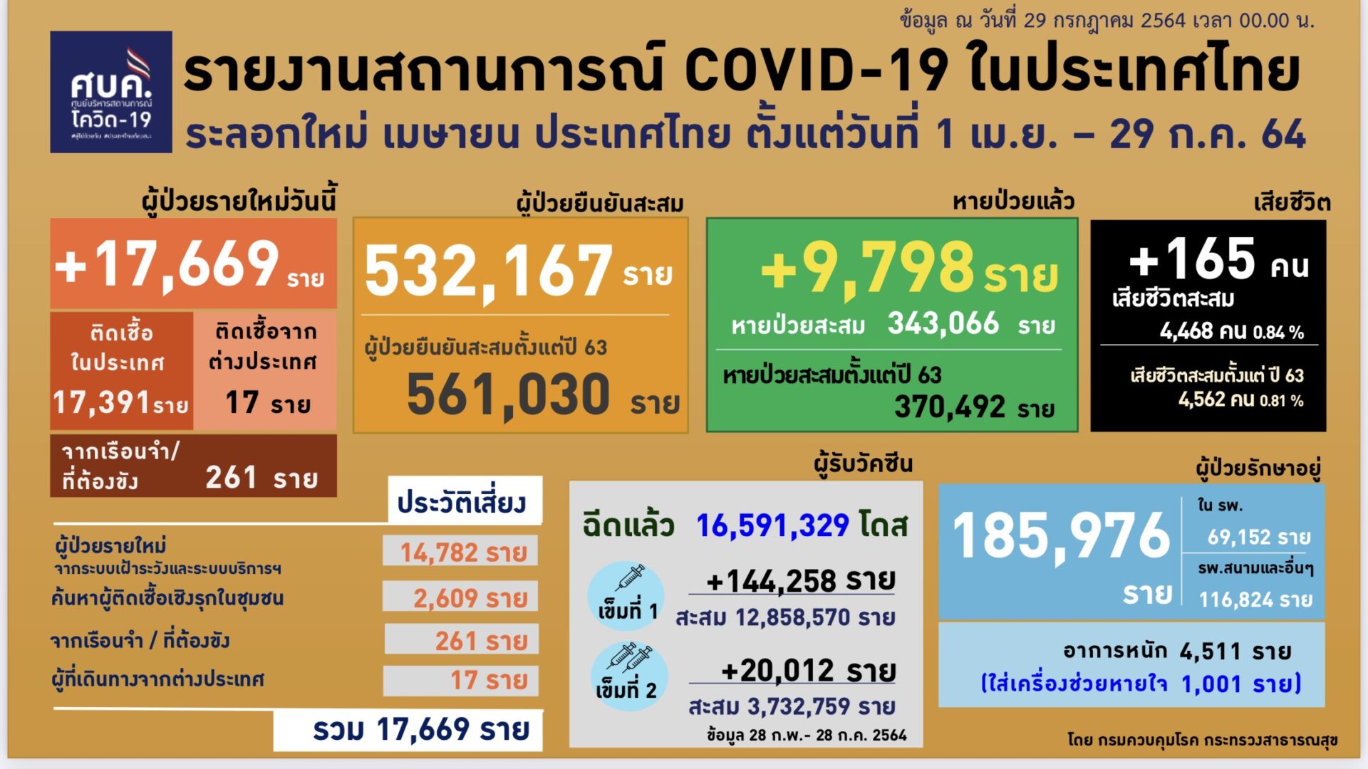 ศูนย์บริหารสถานการณ์โควิด-19 (ศบค.) รายงานสถานการณ์การแพร่ระบาดของโรคโควิด-19 ในประเทศ วันนี้ (29 ก.ค.) ว่า พบผู้ติดเชื้อรายใหม่ 17,669 ราย โดยแบ่งเป็นติดเชื้อในประเทศ 17,408 ราย เป็นผู้ติดเชื้อจากระบบเฝ้าระวังและระบบบริการ 14,782 ราย จากการค้นหาเชิงรุกในชุมชน 2,609 ราย จากเรือนจำ/ที่ต้องขัง 261 ราย และผู้เดินทางมาจากต่างประเทศเข้า State Quarantine 17 ราย พบผู้ป่วยยืนยันสะสมตั้งแต่ปี 2563 จำนวน 561,030 ราย รักษาหายเพิ่ม 9,798 ราย กำลังรักษาอยู่ 185,976 ราย เป็นผู้ป่วยอาการหนัก 4,511 ราย ใส่เครื่องช่วยหายใจ 1,001 ราย เสียชีวิตเพิ่ม 165 ราย รวมเสียชีวิต 4,562 คน
