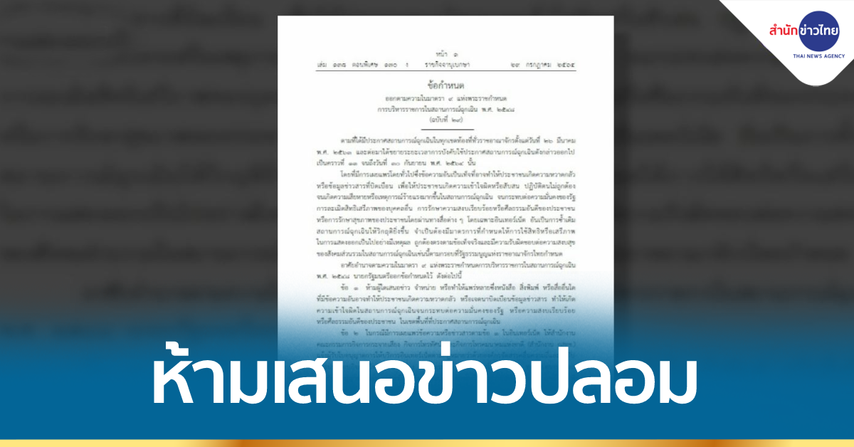 กรุงเทพฯ 30 ก.ค.-ราชกิจจานุเบกษา เผยแพร่ประกาศ ห้ามเสนอข่าวอันเป็นเท็จ ทำให้ประชาชนเกิดความหวาดกลัว กระทบต่อความมั่นคงรัฐ หรือศีลธรรมอันดีของประชาชน ในเขตพื้นที่ประกาศสถานการณ์ฉุกเฉิน หากพบมีการกระทำผิด ให้ กสทช. ควบคุมระงับการให้บริการทางอินเทอร์เน็ต และส่งดำเนินคดี