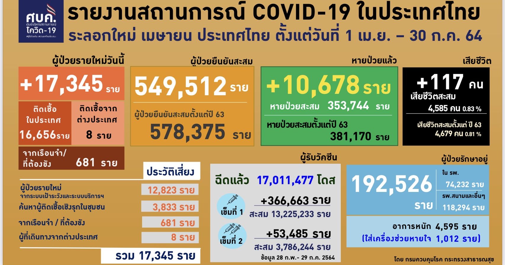 ทำเนียบรัฐบาล 30 ก.ค.-ศบค.เผยจำนวนติดเชื้อโควิด-19 ใหม่ 17,345 ราย เสียชีวิต 117 คน กทม.ยังติดอันดับมากสุด ปัจจัยเสี่ยงจากคนในครอบครัว ไปพื้นที่แออัดพบ 6 คลัสเตอร์ใหม่