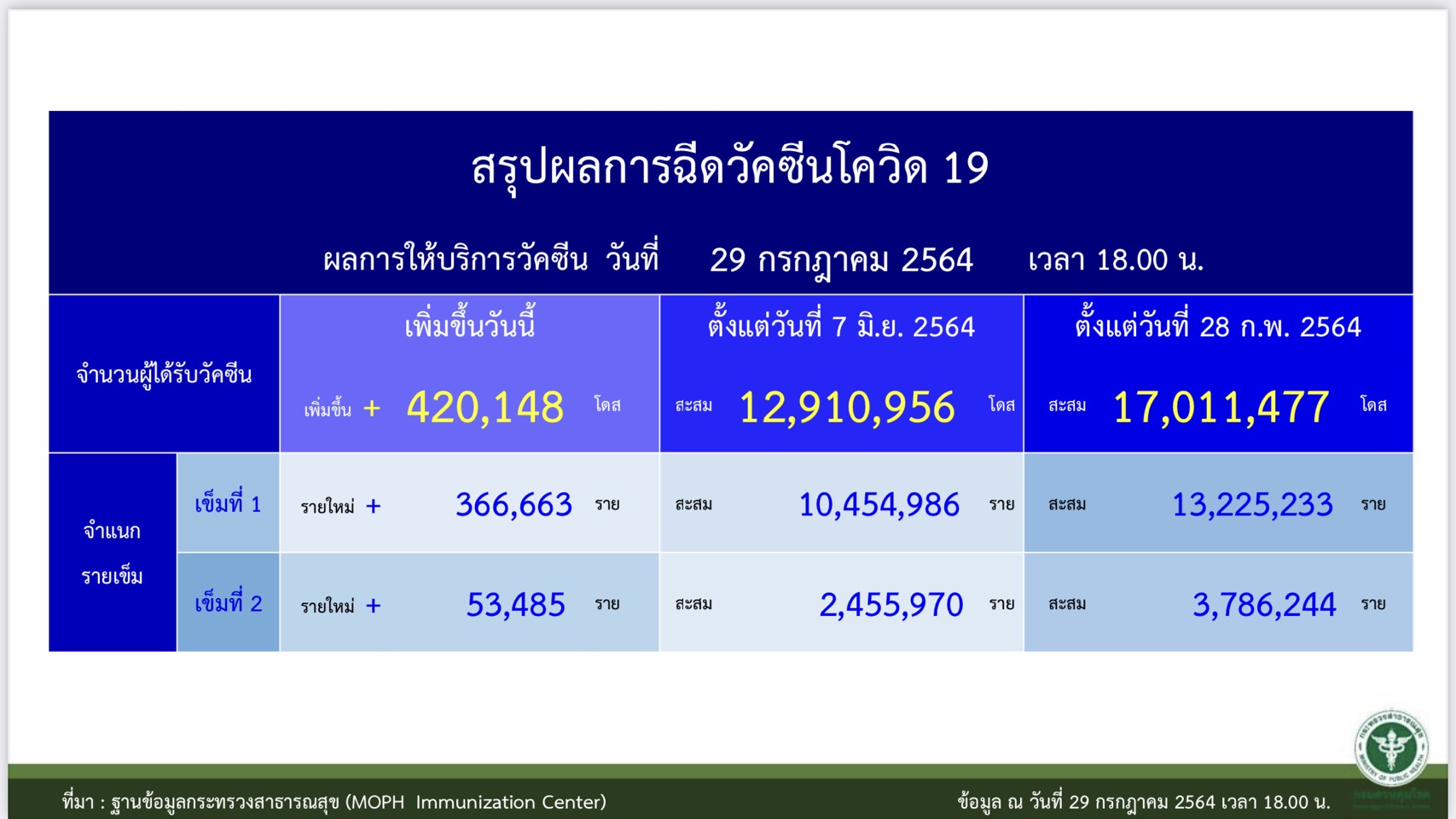 นพ.ทวีศิลป์ กล่าวว่า ส่วนการฉีดวัคซีนโควิด-19 เมื่อวานนี้ (29 ก.ค.) มีผู้ฉีดวัคซีนเพิ่มขึ้น 420,148 โดส แบ่งเป็นเข็มที่ 1 จำนวน 366,663 ราย เข็มที่ 2 จำนวน 53,485 ราย ยอดผู้ฉีดวัคซีน 17,011,477 โดส.-สำนักข่าวไทย