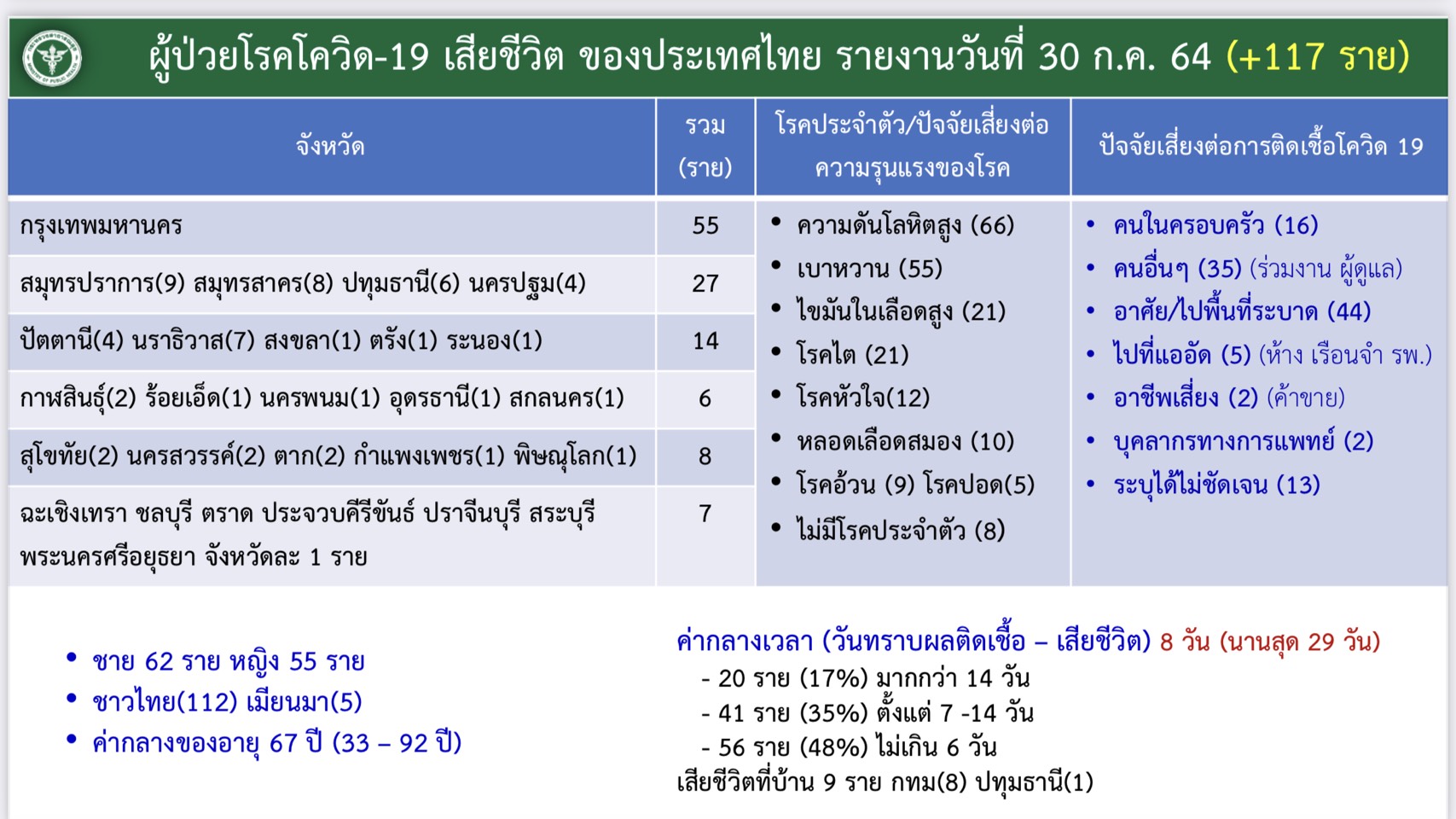 “วันนี้มีผู้เสียชีวิต 117 คน ปัจจัยเสี่ยงจากโรคประจำตัว คนในครอบครัว และไปในพื้นที่แออัด เป็นชาย 62 ราย หญิง 55 ราย เป็นคนไทย 112 คน เมียนมา 5 คน อายุระหว่าง 33 – 92 ปี โดยกทม.มีผู้เสียชีวิตมากที่สุด 55 ราย สมุทรปราการ 9 ราย สมุทรสาคร 8 ราย นราธิวาส 7 ราย ปทุมธานี 6 ราย นครปฐมและปัตตานี จังหวัดละ 4 ราย กาฬสินธุ์ สุโขทัย นครสวรรค์และตาก จังหวัดละ 2 ราย ส่วนที่สงขลา ตรัง ระนอง ร้อยเอ็ด นครพนม อุดรธานี สกลนคร กำแพงเพชร พิษณุโลก ฉะเชิงเทรา ชลบุรี ตราด ประจวบคีรีขันธ์ ปราจีนบุรี สระบุรี และพระนครศรีอยุธยา จังหวัดละ 1 ราย” โฆษก ศบค. กล่าว