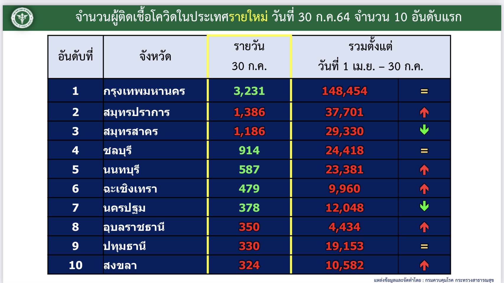 นพ.ทวีศิลป์ วิษณุโยธิน โฆษกศูนย์บริหารสถานการณ์แพร่ระบาดของโรคติดเชื้อไวรัสโคโรนา 2019 หรือศบค. แถลงจำนวนผู้ติดเชื้อรายใหม่ 17,345 ราย เป็นผู้ติดเชื้อในประเทศ 16,656 ราย ติดเชื้อจากต่างประเทศ 8 ราย จากเรือนจำ / ที่ต้องขัง 681 ราย ผู้ป่วยรักษาอยู่ 192,526 ราย โดยรักษาอยู่ในโรงพยาบาล 74,232 ราย โรงพยาบาลสนามและอื่น ๆ 118,294 ราย ผู้ป่วยอาการหนัก 4,595 ราย ใส่เครื่องช่วยหายใจ 1,012 ราย กทม.มีผู้ติดเชื้อมากที่สุด 3,231 ราย สมุทรปราการ 1,386 ราย สมุทรสาคร 1,186 ราย ชลบุรี 914 ราย นนทบุรี 587 ราย ฉะเชิงเทรา 479 ราย นครปฐม 378 ราย อุบลราชธานี 350 ราย ปทุมธานี 330 รายและสงขลา 324 ราย