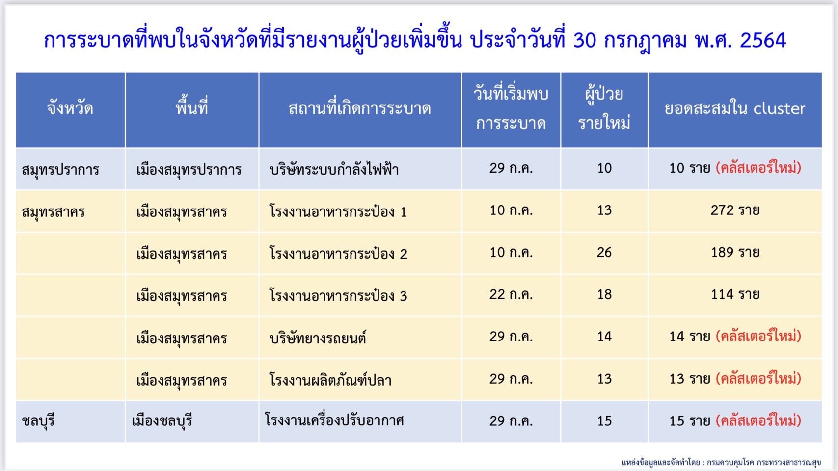 นพ.ทวีศิลป์ กล่าวว่า พบคลัสเตอร์ใหม่ 6 แห่ง คือที่บริษัทระบบกำลังไฟฟ้า เมืองสมุทรปราการ จังหวัดสมุทรปราการ บริษัทยางรถยนต์และโรงงานผลิตภัณฑ์ปลา เมืองสมุทรสาคร จังหวัดสมุทรสาคร โรงงานเครื่องปรับอากาศ เมืองชลบุรี จังหวัดชลบุรี บริษัทยางรถยนต์ คลองหลวง จังหวัดปทุมธานี และโรงงานแม่แบบเซรามิค สะเดา จังหวัดสงขลา ส่วนการแพร่ระบาดในโรงงานอุตสาหกรรม ตั้งแต่วันที่ 1 เมษายน 2564 ถึง 29 กรกฎาคม 2564 พบการแพร่ระบาด 518 แห่ง 36,816 คน ใน 49 จังหวัด จังหวัดที่พบผู้ติดเชื้อในโรงงานมากที่สุด คือเพชรบุรี 4,464 คน เพชรบูรณ์ 3,487 คน ประจวบคีรีขันธ์ 2,538 คน สมุทรสาคร 2,496 คน และสงขลา 2,209 คน