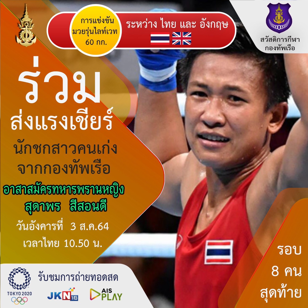 กองทัพเรือ 2 ส.ค.-กองทัพเรือชวนคนไทยร่วมส่งแรงใจเชียร์ “สุดาพร สีสอนดี” นักกีฬามวยสากลหญิง รุ่น 60 กก.พรุ่งนี้
