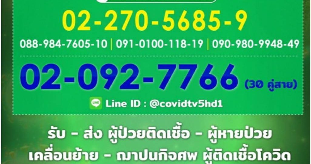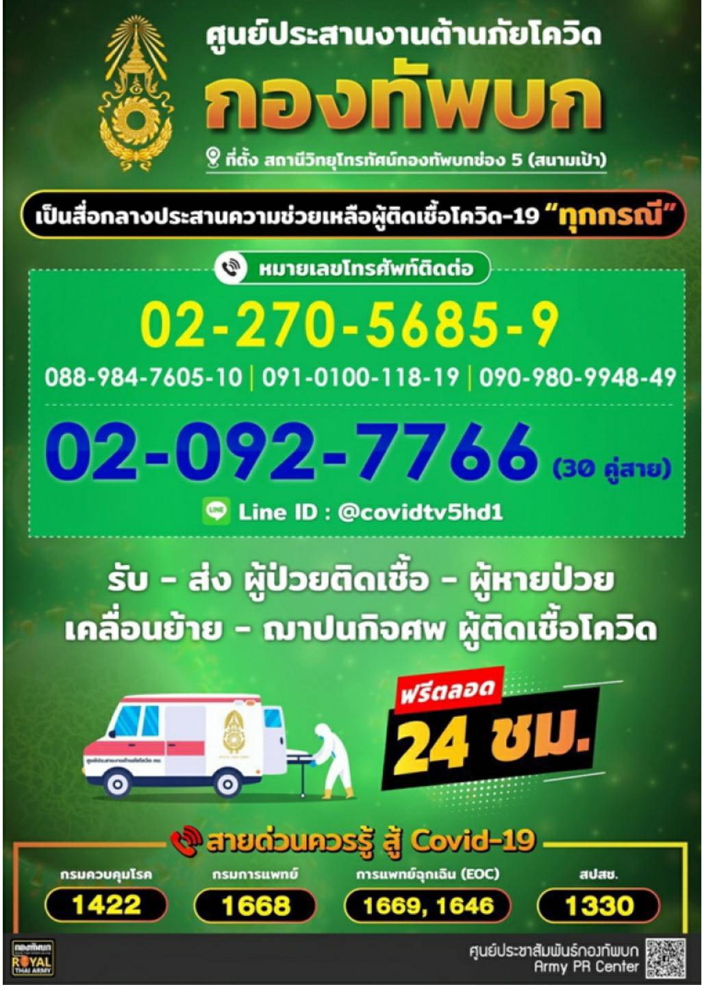 ผู้สื่อข่าวรายงานว่า กองทัพบกจัดตั้ง “ศูนย์ประสานงานต้านภัยโควิด-19 กองทัพบก” โดยรับเป็นสื่อกลางแก้ไขปัญหาความเดือดร้อนของประชาชนในสถานการณ์โควิด ทั้งข้อติดขัดเรื่องการรักษาพยาบาล การเคลื่อนย้ายผู้ป่วยโควิดหรือผู้เสียชีวิต การจัดพิธีศพผู้เสียชีวิตจากโควิดฯ ผู้ป่วยที่ต้องการเดินทางกลับภูมิลำเนา ผ่าน CALL CENTER 02-092-7766 จำนวน 30 คู่สาย088-984-7605-10, ,091-010-0118-19,090-980-9948-49 และหมายเลขเดิมคือ 02-270-5685-9 Line id : @covidtv5hd1.-สำนักข่าวไทย