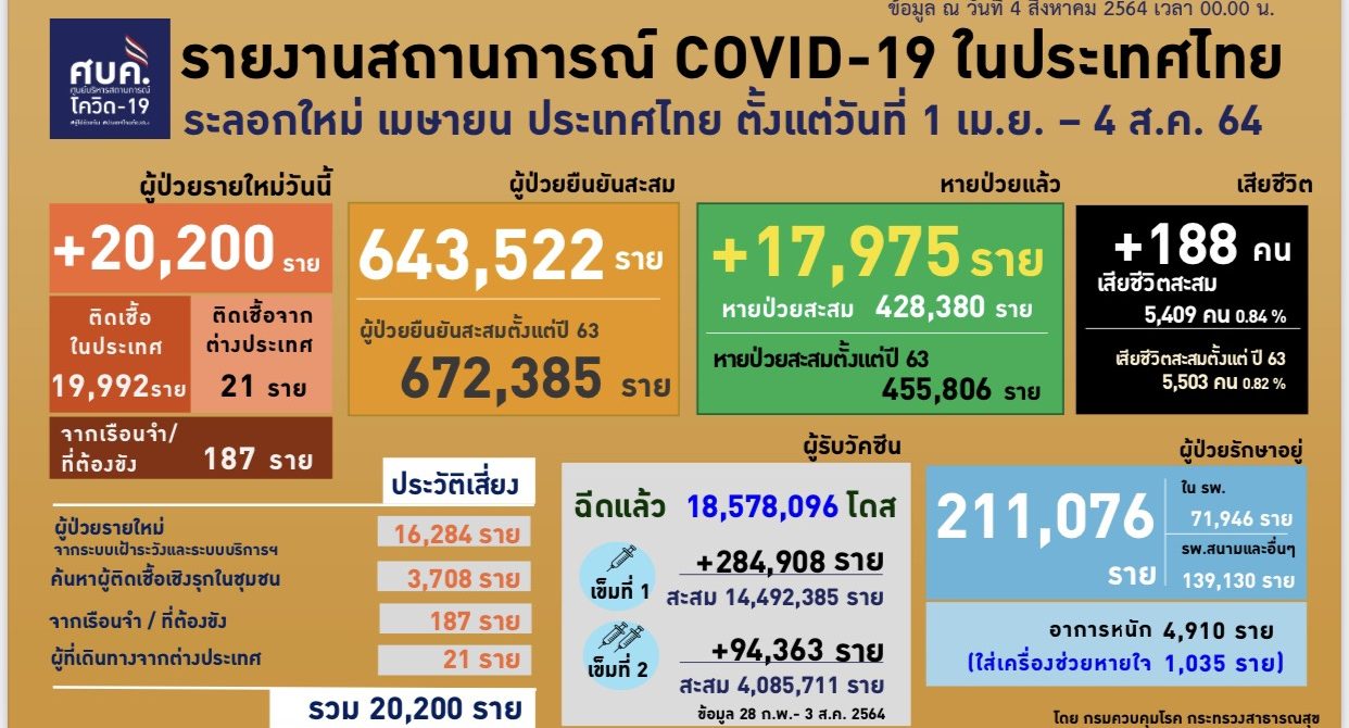 ผู้สื่อข่าวรายงาน สถานการณ์แพร่ระบาดของโรคโควิด-19 ประจำวัน โดยศูนย์บริหารสถานการณ์การแพร่ระบาดของโรคติดเชื้อไวรัสโคโรนา 2019 (ศบค.) รายงานว่าวันนี้พบผู้ติดเชื้อโควิดรายใหม่อีก 20,200 ราย แบ่งเป็นผู้ติดเชื้อรายใหม่ 20,013 ราย และผู้ติดเชื้อในเรือนจำ 187 ราย ทำให้มียอดผู้ป่วยยืนยันสะสมตั้งแต่ 1 เมษายน 643,522 ราย หายป่วยกลับบ้าน 17,975 ราย หายป่วยสะสม 428,380 ราย กำลังรักษา 211,076 ราย