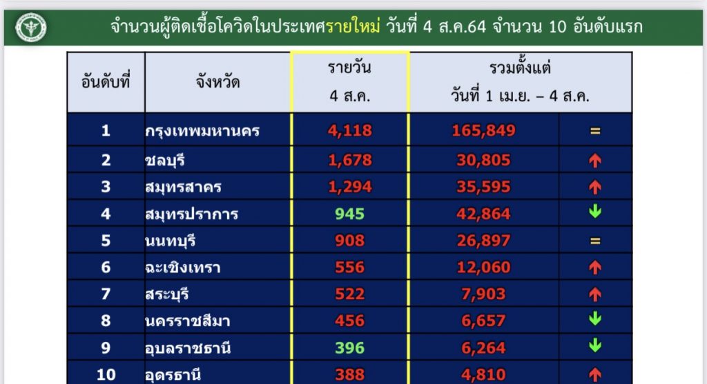 ทำเนียบ วันนี้ (4 ส.ค.) นิวไฮ ผู้ป่วยโควิดวันนี้ทะลุ 2 หมื่น กรุงเทพมีผู้ติดเชื้อสูงสุด 4,118 คน พบผู้ติดเชื้อทั่วประเทศ 77 จังหวัด