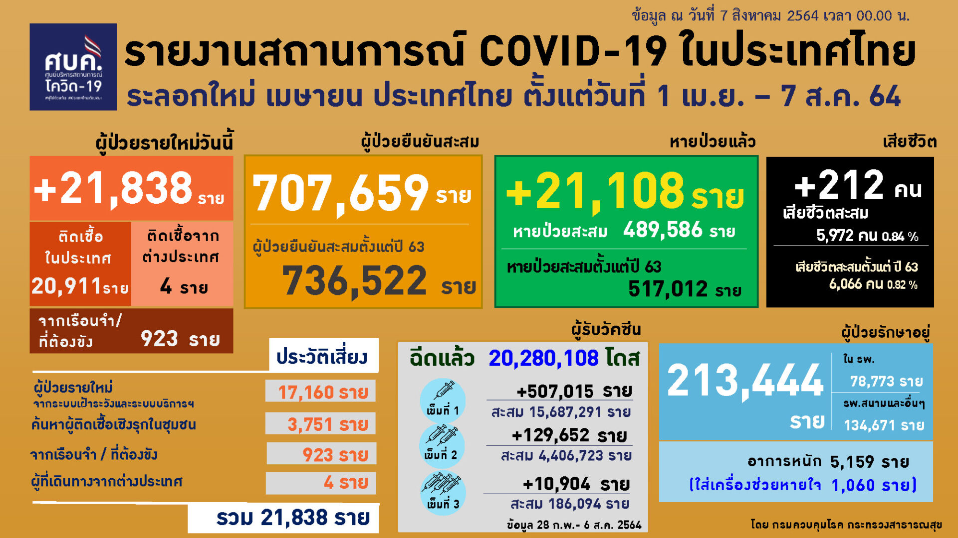 กรุงเทพฯ 7 ส.ค.-ศบค. เผยไทยพบผู้ติดเชื้อโควิด-19 รายใหม่ 21,838 ราย ป่วยอาการหนัก 5,159 ราย ใส่เครื่องช่วยหายใจ 1,060 ราย พบผู้เสียชีวิต 212 ราย เป็นหญิงตั้งครรภ์ 2 ราย เสียชีวิตที่บ้าน 4 ราย ขณะที่ กทม. ยอดป่วยใหม่ยังสูง 4,221 ราย การแพร่ระบาดเพิ่มขึ้นทั้งประเทศ โดยเฉพาะจังหวัดสีแดงเข้ม ส่วนคลัสเตอร์โรงงานยังพบต่อเนื่อง