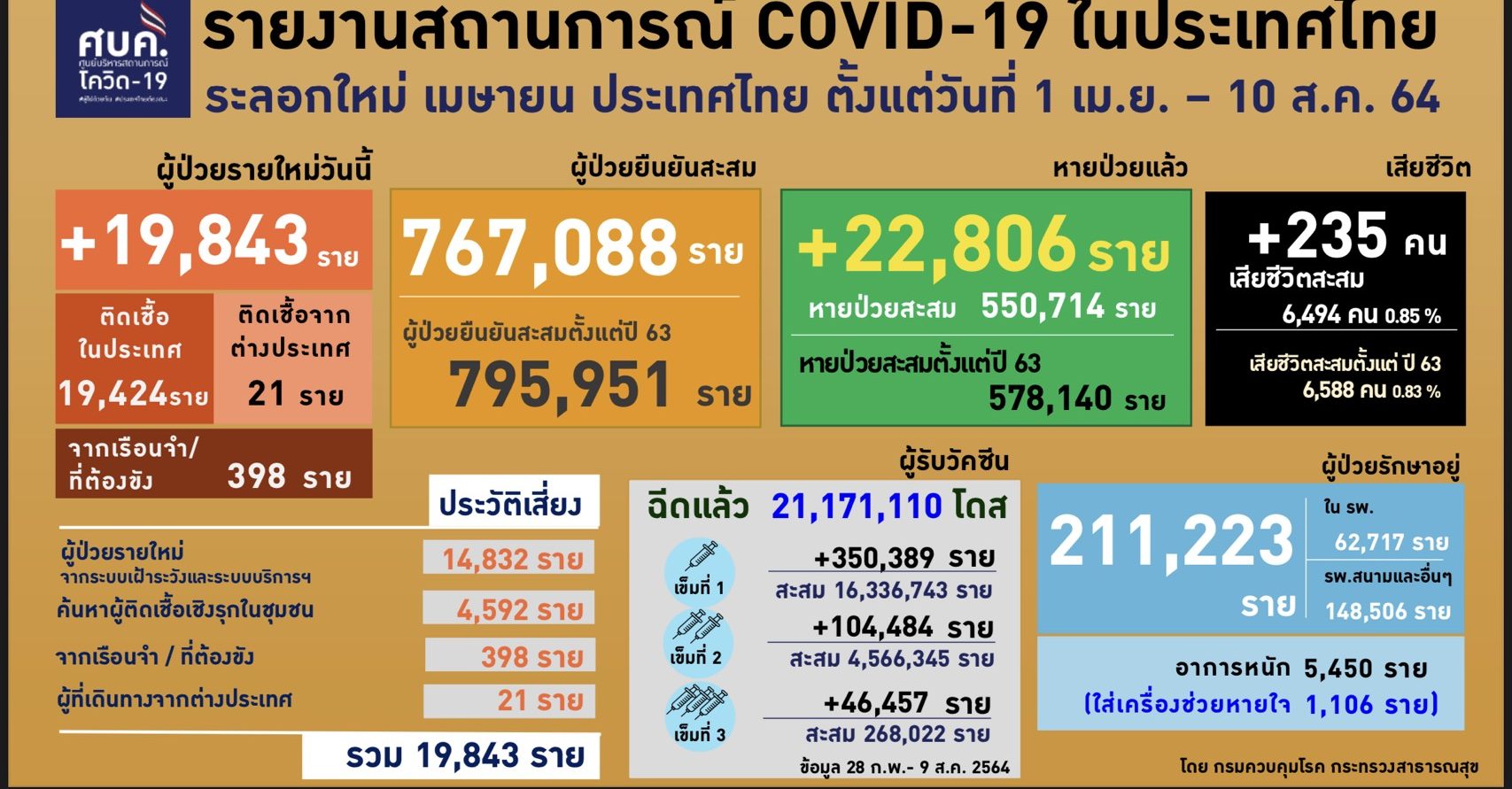 ศูนย์บริหารสถานการณ์โควิด-19 (ศบค.) รายงานสถานการณ์การแพร่ระบาดของโควิด-19 ในประเทศวันนี้ (10 ส.ค.) ว่า พบผู้ติดเชื้อรายใหม่ 19,843 ราย โดยแบ่งเป็นติดเชื้อในประเทศ 19,445 ราย จากเรือนจำ/ที่ต้องขัง 398 ราย สะสม 795,951 ราย รักษาหายป่วยเพิ่ม 22,806 ราย สะสม 578,140 ราย กำลังรักษาอยู่ 211,223 ราย แบ่งเป็นรักษาในโรงพยาบาล 62,717 ราย และโรงพยาบาลสนาม 148,506 ราย เป็นผู้ป่วยอาการหนัก 5,450 ราย ใส่เครื่องช่วยหายใจ 1,106 ราย เสียชีวิตเพิ่ม 235 ราย รวมเสียชีวิต 6,588 คน