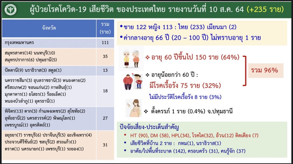 สำหรับผู้เสียชีวิตทั้ง 235 ราย เป็นชาวไทย 233 เมียนมา 2 ราย ชาย 122 ราย หญิง 113 ราย กทม. 111 ราย สมุทรสาคร 14 ราย พิจิตร 13 ราย นนทบุรี 10 ราย ปัตตานี 9 ราย พระนครศรีอยุธยา 7 ราย สมุทรปรากร ราชบุรี จังหวัดละ 6 ราย ปทุมธานี ปราจีนบุรี จังหวัดละ 5 ราย ฉะเชิงเทรา 4 ราย นราธิวาส นครราชสีมา อุบลราชธานี ตาก จังหวัดละ 3 ราย หนองคาย ศรีสะเกษ ขอนแก่น กำแพงเพชร สุโขทัย อุทัยธานี นครสวรรค์ ประจวบคีรีขันธ์ ชลบุรี จังหวัดละ 2 ราย สตูล กาฬสินธุ์ มุกดาหาร ยโสธร ร้อยเอ็ด หนองบัวลำภู อุดรธานี พิษณุโลก เพชรบูรณ์ อุตรดิตถ์ สระแก้ว ตราด นครนายก เพชรบุรี ระยอง จังหวัดละ 1 ราย โรคประจำตัวยังเป็นปัจจัยเสี่ยงความดันโลหิตสูง เบาหวาน ไขมันในเลือดสูง พบตั้งครรภ์ 1 ราย ปทุมธานี ปัจจัยเสี่ยงในการติดเชื้อคนในครอบครัว จากคนอื่นๆ อายุค่ากลาง 66 ปี อายุน้อยสุด 20 ปี อายุมากสุด 100 ปี เสียชีวิตที่บ้าน 2 ราย กทม. 1 ราย นราธิวาส 1 ราย