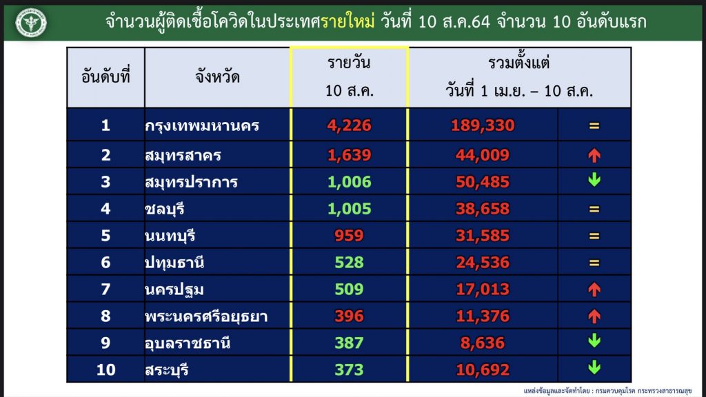ส่วน 10 อันดับ ผู้ติดเชื้อโควิด-19 ในประเทศ คือ 1. กรุงเทพมหานคร 4,226 ราย 2. สมุทรสาคร 1,639 ราย 3. สมุทรปราการ 1,006 ราย 4. ชลบุรี 1,005 ราย 5. นนทบุรี 959 ราย 6. ปทุมธานี 528 ราย 7. นครปฐม 509 ราย 8. พระนครศรีอยุธยา 396 ราย 9. อุบลราชธานี 387 ราย 10. สระบุรี 373 ราย