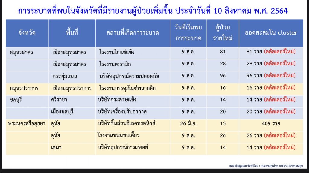 - ชลบุรี พบคลัสเตอร์ใหม่ 2 แห่ง บริษัทกระดาษแข็ง อ.ศรีราชา14 ราย , บริษัทเครื่องปรับอากาศ อ.เมือง 20 ราย