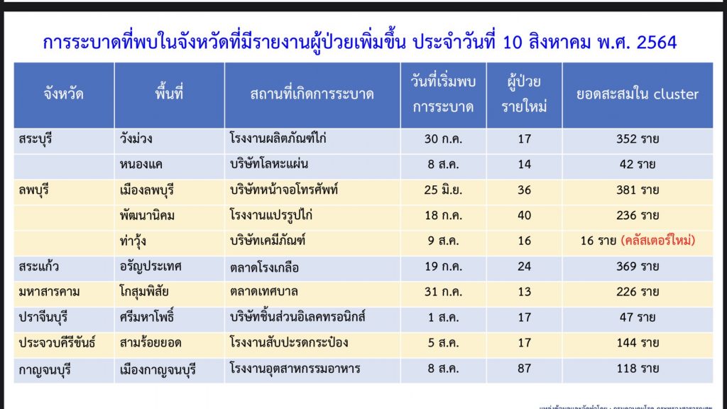 - พระนครศรีอยุธยา พบคลัสเตอร์ใหม่ 2 แห่ง โรงงานขนมขบเคี้ยว อ.อุทัย 26 ราย , บริษัทอุปกรณ์การแพทย์ อ.เสนา 14 ราย