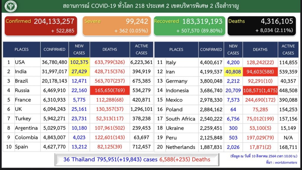 สำหรับสถานการณ์โควิด-19 ทั่วโลก พบยอดผู้ติดเชื้อรวม 204,133,257 ราย อาการรุนแรง 99,242 ราย รักษาหายแล้ว 183,319,193 ราย เสียชีวิต 4,316,105 ราย อันดับประเทศที่มีผู้ติดเชื้อสูงสุด 1. สหรัฐอเมริกา จำนวน 36,780,480 ราย 2. อินเดีย จำนวน 31,997,017 ราย 3. บราซิล จำนวน 20,178,143 ราย 4. รัสเซีย จำนวน 6,469,910 ราย 5. ฝรั่งเศส จำนวน 6,310,933 ราย ส่วนประเทศไทย อยู่ในอันดับที่ 36 จำนวน 795,951 ราย.-สำนักข่าวไทย