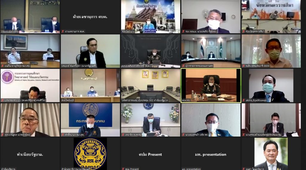 พล.อ.ประยุทธ์ จันทร์โอชา นายกรัฐมนตรีและรัฐมนตรีว่าการกระทรวงกลาโหม พร้อมด้วยนายอนุทิน ชาญวีรกูล รองนายกรัฐมนตรีและรัฐมนตรีว่าการกระทรวงสาธารณสุข พล.อ.อนุพงษ์ เผ่าจินดา รัฐมนตรีว่าการกระทรวงมหาดไทย นายศักดิ์สยาม ชิดชอบ รัฐมนตรีว่าการกระทรวงคมนาคม พล.อ.ณัฐพล นาคพาณิชย์ เลขาธิการสภาความมั่นคงแห่งชาติ (สมช.) พล.อ.เฉลิมพล ศรีสวัสดิ์ ผู้บัญชาการทหารสูงสุด พล.อ.ณรงค์พันธ์ จิตต์แก้วแท้ ผู้บัญชาการทหารบก และหน่วยงานอื่นๆ ที่เกี่ยวข้อง ร่วมประชุมผ่านระบบวิดีโอคอนเฟอเรนซ์ ติดตามการบริหารจัดการดูแลผู้ติดเชื้อโควิด-19 แบบ Home Isolation และ Community Isolation และการนำส่งผู้ป่วยกลับภูมิลำเนา
