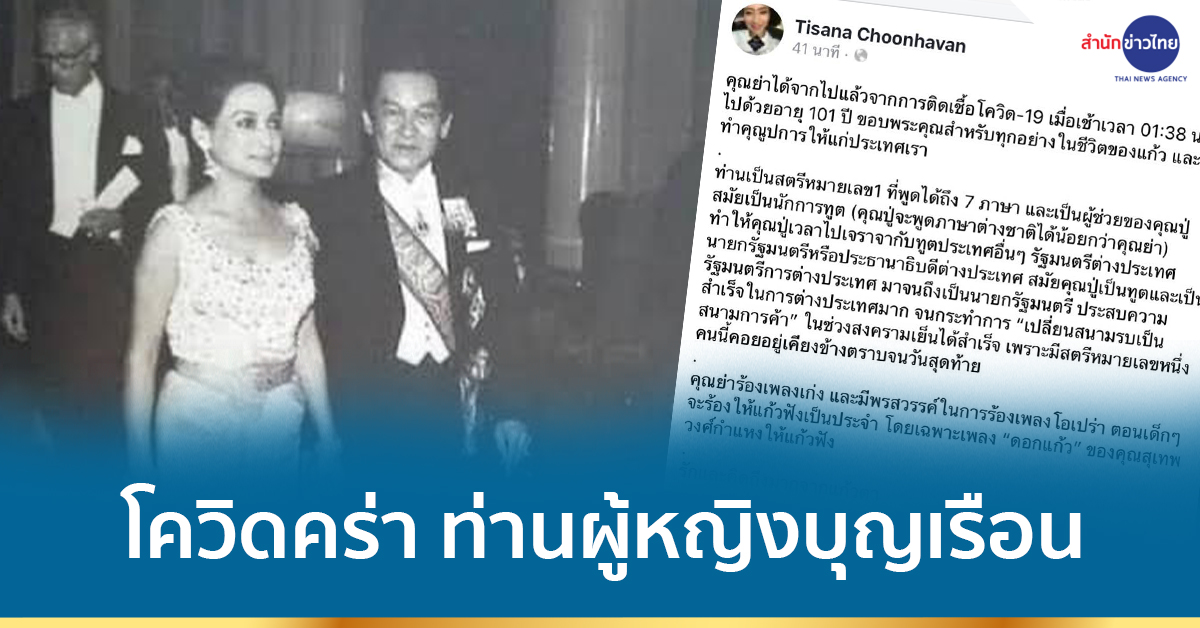 สำนักข่าวไทย 14 ส.ค.-“ท่านผู้หญิงบุญเรือน” ภริยา พลเอกชาติชาย ชุณหะวัณ อดีตนายกรัฐมนตรี ถึงแก่อนิจกรรม ด้วยโรคโควิด-19 รวมอายุ 101 ปี