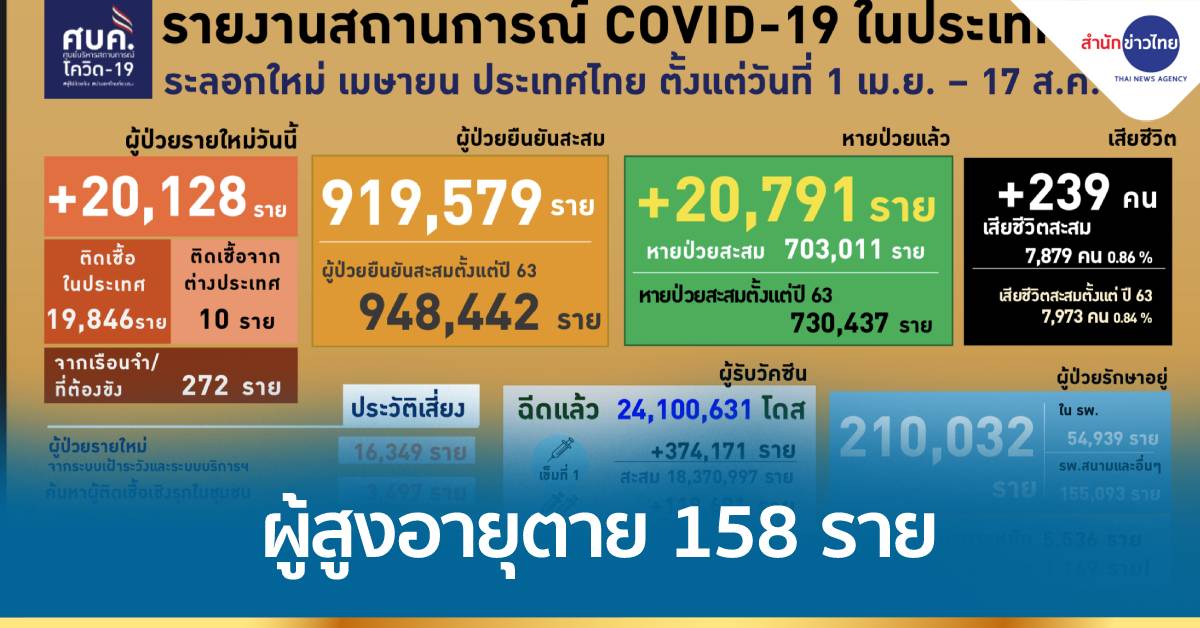 ศูนย์บริหารสถานการณ์โควิด -19 (ศบค.) รายงานสถานการณ์โควิด-19ในประเทศไทย วันนี้(17 ส.ค.) พบผู้ป่วยรายใหม่ 20,128 ราย ติดเชื้อในประเทศ 19,846 ราย แบ่งเป็นจากระบบเฝ้าระวังและระบบบริการ 16,349 ราย ค้นหาเชิงรุกในชุมชน 3,497 ราย ติดเชื้อจากต่างประเทศ 10 ราย จากเรือนจำ/ที่ต้องขัง 272 ราย ผู้ป่วยยืนยันสะสม 948,442 ราย ผู้ป่วยรักษาอยู่ 210,032 ราย ในรพ. 54,939 ราย รพ.สนามและอื่นๆ 155,093 ราย อาการหนัก 5,536 ราย ใส่เครื่องช่วยหายใจ 1,169 ราย หายป่วย 20,791 ราย หายป่วยสะสม 730,437 ราย เสียชีวิต 239 ราย เสียชีวิตสะสม 7,973 ราย