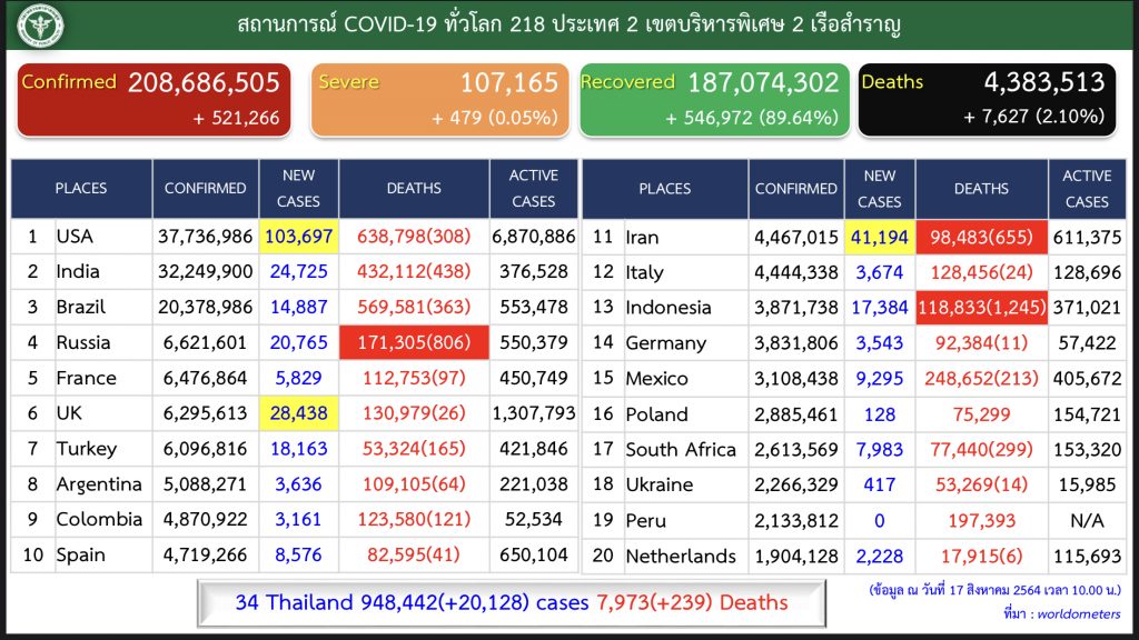 ขณะที่สถานการณ์โควิด-19 ทั่วโลก พบผู้ติดเชื้อแล้ว 208,686,505 ราย ติดเชื้อรายใหม่ 521,266 ราย เสียชีวิตสะสม 4,383,513 ราย โดยสหรัฐฯ ยังงพบผู้ติดเชื้อมากที่สุดสะสม 37,736,986 ราย อินเดีย พบติดเชื้อสะสม 32,249,900 ราย บราซิล พบติดเชื้อสะสม 20,378,986 ราย รัสเซีย พบติดเชื้อสะสม 6,621,601 ราย และฝรั่งเศส พบติดเชื้อสะสม 6,476,864 ราย ส่วนประเทศไทย อยู่อันดับที่ 34 ของโลก