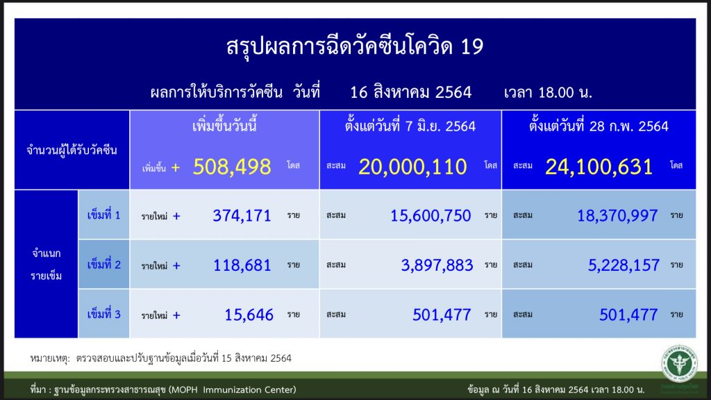 สำหรับการฉีดวัคซีนในประเทศไทย ตั้งแต่วันที่ 28 ก.พ. -16 ส.ค. 64 สะสม 24,100,631 โดส แบ่งเป็น เข็มที่ 1 สะสม 18,370,997 ราย เข็มที่ 2สะสม 5,228,157 ราย เข็มที่ 3 สะสม 501,477 ราย .-สำนักข่าวไทย
