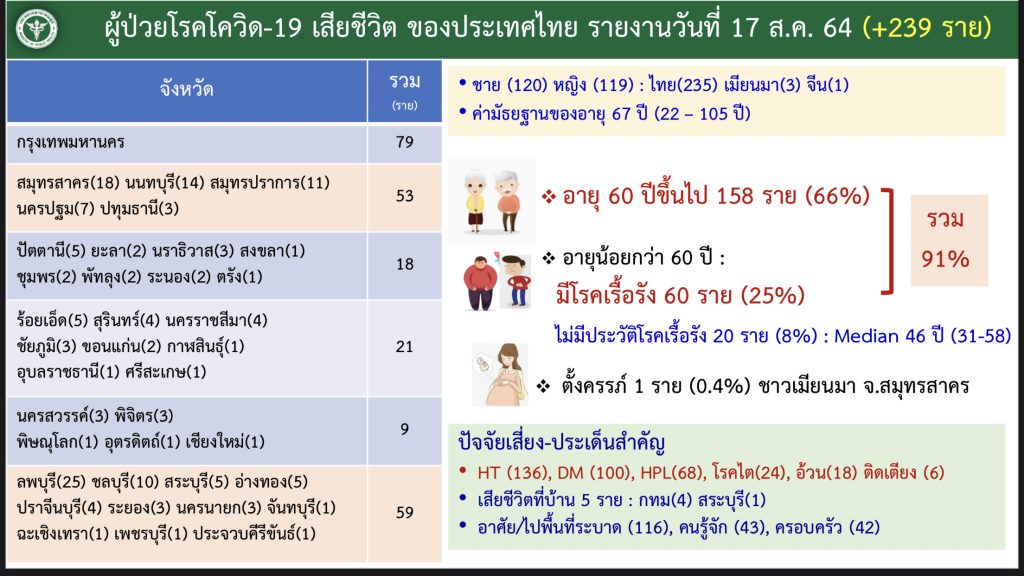 สำหรับรายละเอียดผู้เสียชีวิต 239 ราย เป็นเพศชาย 120 ราย เพศหญิง 119 ราย อายุ 22-105 ปี เป็นชาวไทย 235 ราย เมียนมา 3 ราย จีน 1 ราย โดยอยู่ในพื้นที่ กทม.มากที่สุด 79 ราย สมุทรปราการ 11 ราย สมุทรสาคร 18 ราย ลพบุรี 25 ราย นครปฐม 7 ราย ปัตตานี 5 ราย ยะลา 2 ราย นราธิวาส 3 ราย สงขลา 1 ราย ชุมพร 2 ราย พัทลุง 2 ราย ระนอง 2 ราย ตรัง 1 ราย ร้อยเอ็ด 5 ราย สุรินทร์ 4 ราย นครราชสีมา 4 ราย ชัยภูมิ 3 ราย ขอนแก่น 2 ราย กาฬสินธุ์ 1 ราย อุบลราชธานี 1 ราย ศรีสะเกษ 1 ราย นครสวรรค์ 3 ราย พิจิตร 3 ราย พิษณุโลก 1 ราย อุตรดิตถ์ 1 ราย เชียงใหม่ 1 ราย ลพบุรี 25 ราย ชลบุรี 10 ราย สระบุรี 5 ราย อ่างทอง 5 ราย ปราจีนบุรี 4 ราย ระยอง 3 ราย นครนายก 3 ราย จันทบุรี 1 ราย ฉะเชิงเทรา 1 ราย เพชรบุรี 1 ราย ประจวบคีรีขันธ์ 1 ราย ในจำนวนนี้เป็นการเสียชีวิตที่บ้าน 5 ราย คือ กทม. 4 ราย สระบุรี 1 ราย นอกจากนี้ยังพบหญิงตั้งครรภ์เสียชีวิตด้วย 1 ราย เป็นชาวเมียนมา จ.สมุทรสาคร โดยพบว่าผู้เสียชีวิตอายุ 60 ปีขึ้นไป 158 ราย อายุน้อยกว่า 60 ปี มีโรคเรื้อรัง 60 ราย ไม่มีประวัติโรคเรื้อรัง 20 ราย ทั้งนี้พบว่าปัจจัยเสี่ยงและประเด็นสำคัญของการติดเชื้อจากที่อาศัยและเดินทางไปในพื้นที่ระบาด 116 ราย เติดจากคนในครอบครัว 42 ราย และคนรู้จัก 43 ราย
