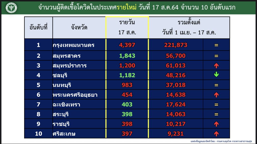 ส่วน 10 จังหวัดที่พบผู้ติดเชื้อรายใหม่มากที่สุด พบว่า กรุงเทพมหานคร ยังมีผู้ติดเชื้อมากที่สุด 4,397 ราย สมุทรสาคร 1,843 ราย สมุทรปราการ1,200 ราย ชลบุรี 1,182 ราย นนทบุรี 983 ราย อยุธยา 454 ราย ฉะเชิงเทรา 403 ราย สระบุรี 398 ราย ราชบุรี 398ราย และศรีสะเกษ 397 ราย