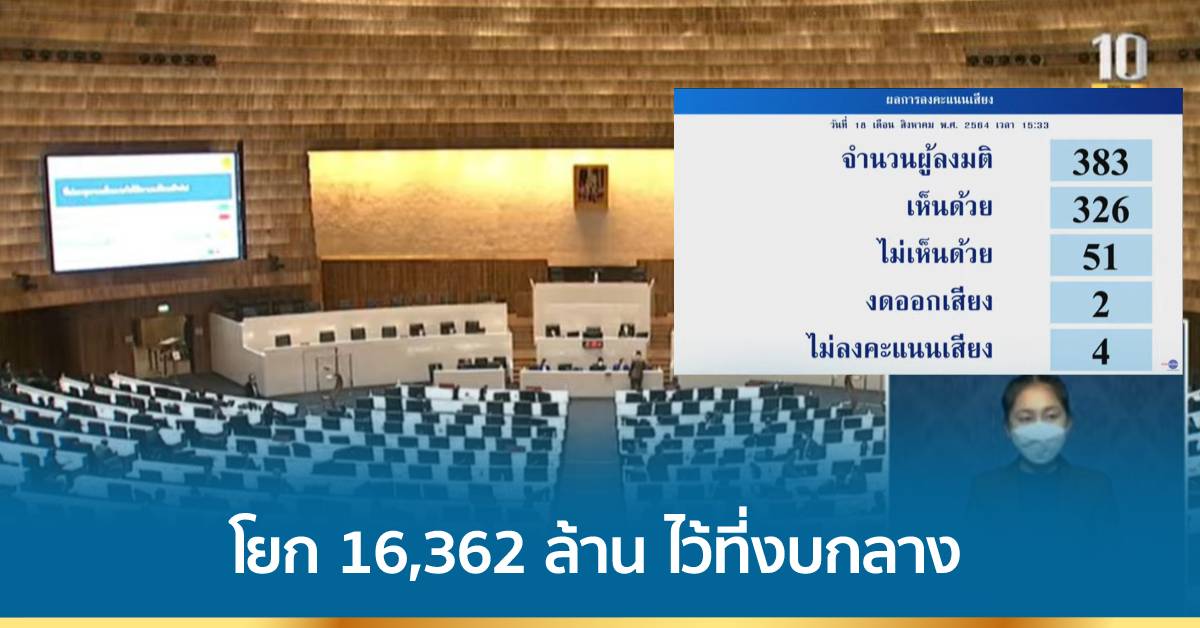 ในที่สุดต้องมีการลงมติและที่ประชุมเสียงข้างมากเห็นชอบตามกรรมาธิการให้โยกงบที่ปรับลด 16,362 ล้านบาทมาไว้ที่งบกลาง ด้วยมติ 326 ต่อ 51 เสียง งดออกเสียง 5 เสียง