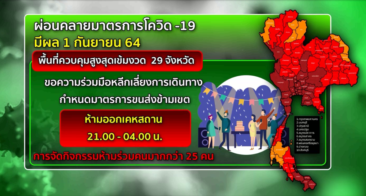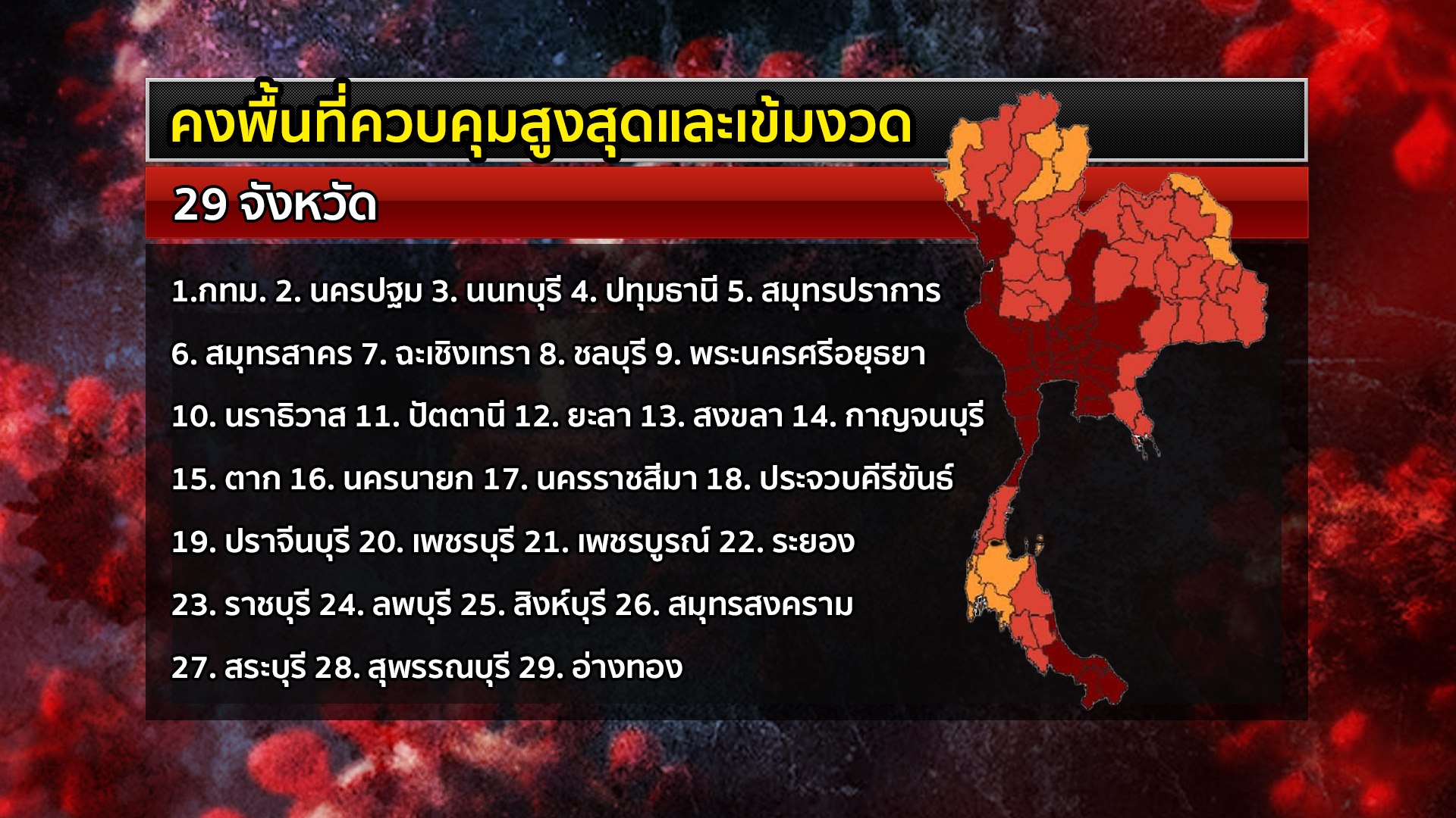 - ข้อ 1 การกำหนดระดับของพื้นที่สถานการณ์เพื่อการบังคับใช้มาตรการควบคุมแบบบูรณาการ พื้นที่ควบคุมสูงสุดและเข้มงวด (พื้นที่สีแดงเข้ม 29 จังหวัด) พื้นที่ควบคุมสูงสุด (พื้นที่สีแดง 37 จังหวัด) และพื้นที่ควบคุม (พื้นที่สีส้ม 11 จังหวัด) ให้ยังคงบังคับใช้ต่อไป
