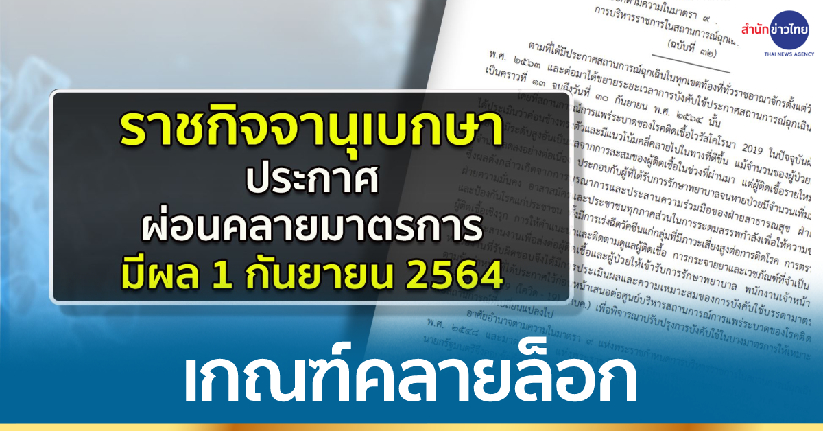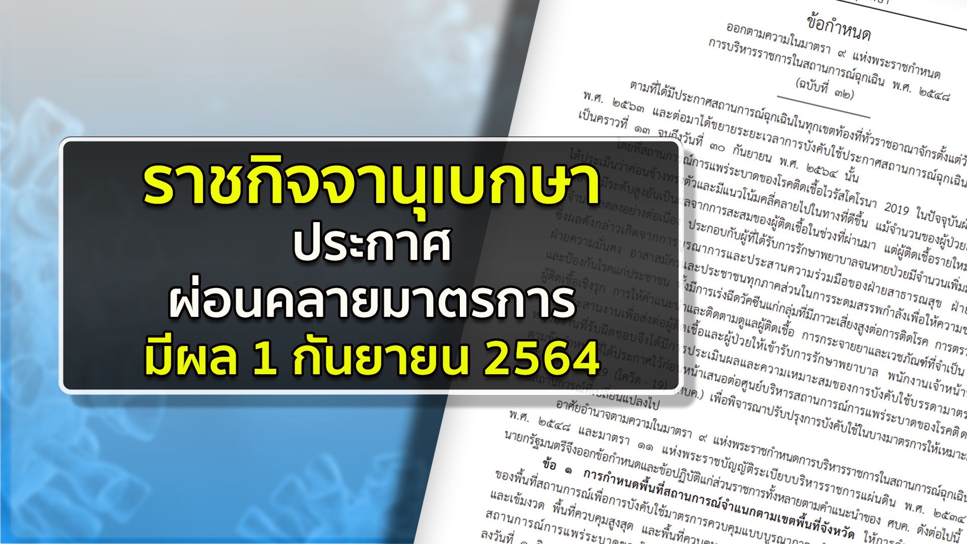 กรุงเทพฯ 29 ส.ค.- เว็บไซต์ราชกิจจานุเบกษาเผยแพร่ ประกาศข้อกำหนดออกตามความในมาตรา 9 แห่งพระราชกำหนดการบริหารราชการในสถานการณ์ฉุกเฉิน พ.ศ.2548 (ฉบับที่ 32) คลายล็อกดาวน์ 29 จังหวัดพื้นที่สีเเดงเข้ม มีผล 1 ก.ย.นี้