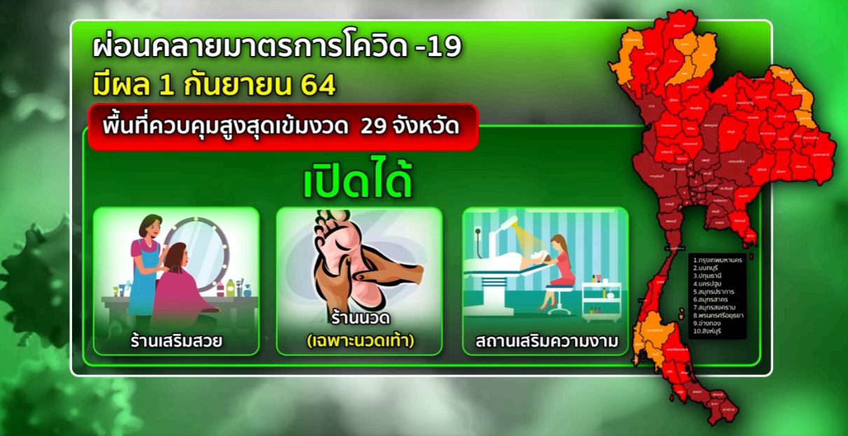 – ก.คลินิกเวชกรรมเสริมความงาม สถานเสริมความงาม สามารถเปิดดำเนินการและให้บริการได้ผ่านการนัดหมาย ส่วนร้านเสริมสวย แต่งผมหรือตัดผมให้เปิดบริการได้โดยผ่านการนัดหมายและจัดกัดเวลาให้บริการในร้านไม่เกินรายละ 1 ชั่วโมง