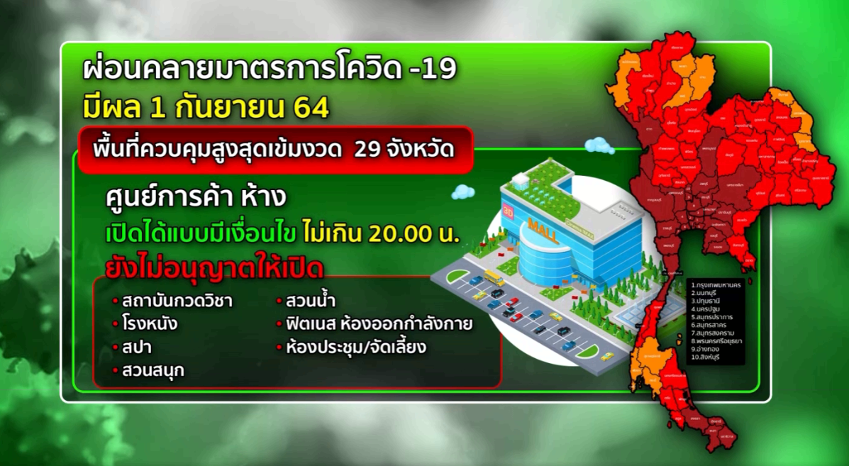 6.ห้างสรรสินค้า ศูนย์การค้า คอมมูนิตี้มอลล์ หรือ สถานประกอบกิจการอื่นที่มีลักษณะคล้ายกันสามารถเปิดได้ตามเวลาปกติของสถานที่นั้นๆ จนถึงเวลา 20.00 น.