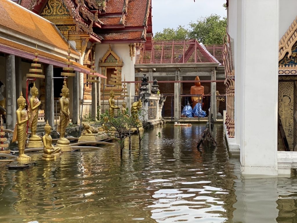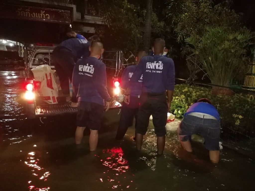 ผู้สื่อข่าวรายงานว่า เมื่อช่วงเย็นวันนี้ (2 ก.ย.) กองทัพเรือ โดยศูนย์บรรเทาสาธารณภัย ฐานทัพเรือกรุงเทพ ร่วมกับอาสาสมัครจากหน่วยงานต่างๆ เพื่อเร่งช่วยเหลือวางแนวกระสอบทรายป้องกันน้ำท่วมโบสถ์ โบราณสถานวัดกิ่งแก้ว อ.บางพลี จ.สมุทรปราการ ซึ่งมีระดับน้ำสูงประมาณ 40-50 ซม. หลังได้รับผลกระทบจากสถานการณ์ฝนตกหนักต่อเนื่องในพื้นที่กรุงเทพฯ และปริมณฑล ทำให้เกิดน้ำท่วมสูงในหลายพื้นที่