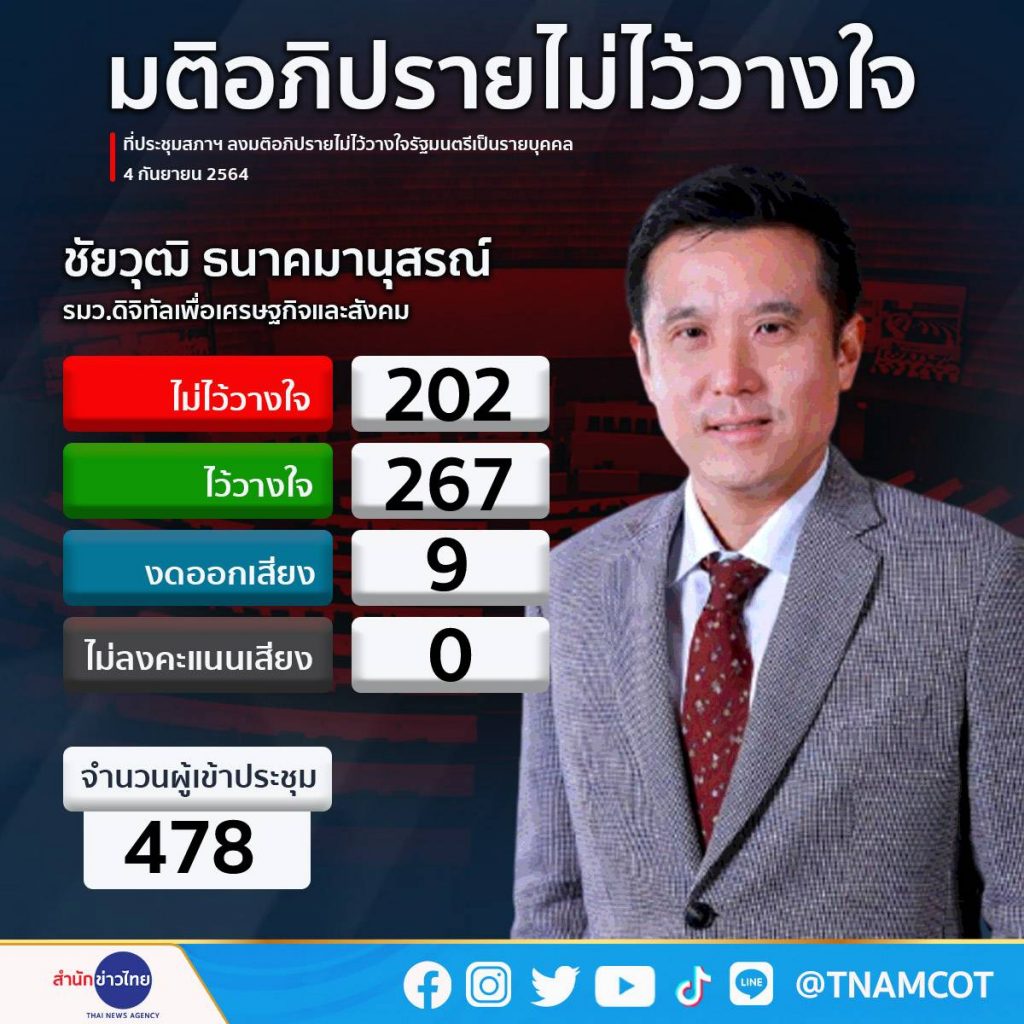 นายชัยวุฒิ ธนาคมานุสรณ์ รัฐมนตรีว่าการกระทรวงดิจิทัลเพื่อเศรษฐกิจและสังคม มีคะแนน ไว้วางใจ 267 เสียง ไม่ไว้วางใจ 202 เสียง งดออกเสียง 9 เสียง