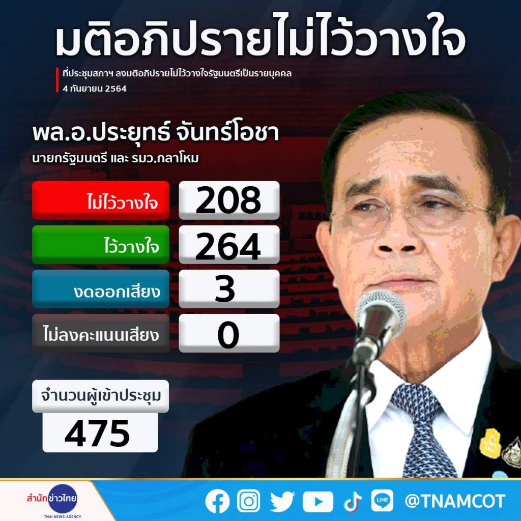 รัฐสภา วันนี้ (4 ก.ย.) ผู้สื่อข่าวรายงานว่า ที่ประชุมสภาผู้แทนราษฎรลงมติอภิปรายไม่ไว้วางใจรัฐมนตรีเป็นรายบุคคล ตามมาตรา 151 ปรากฏผลการลงคะแนน ว่า พล.อ.ประยุทธ์ จันทร์โอชา นายกรัฐมนตรีและรัฐมนตรีว่าการกระทรวงกลาโหม มีคะแนนไว้วางใจ 264 เสียง ไม่ไว้วางใจ 208 เสียง งดออกเสียง 3 เสียง