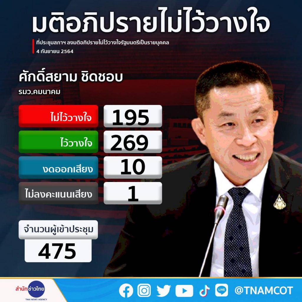 นายศักดิ์สยาม ชิดชอบ รัฐมนตรีว่าการกระทรวงคมนาคม มีคะแนน ไว้วางใจ 269 เสียง ไม่ไว้วางใจ 195 เสียง งดออกเสียง 10 เสียง ไม่ลงคะแนน 1 เสียง