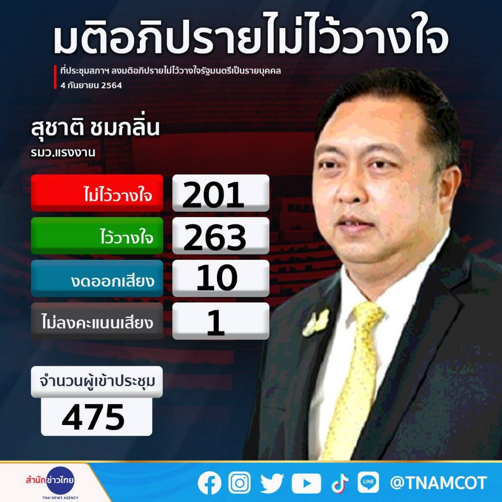 นายสุชาติ ชมกลิ่น รัฐมนตรีว่าการกระทรวงแรงงาน มีคะแนน ไว้วางใจ 263 เสียง ไม่ไว้วางใจ 201 เสียง งดออกเสียง 10 เสียง ไม่ลงคะแนน 1 เสียง