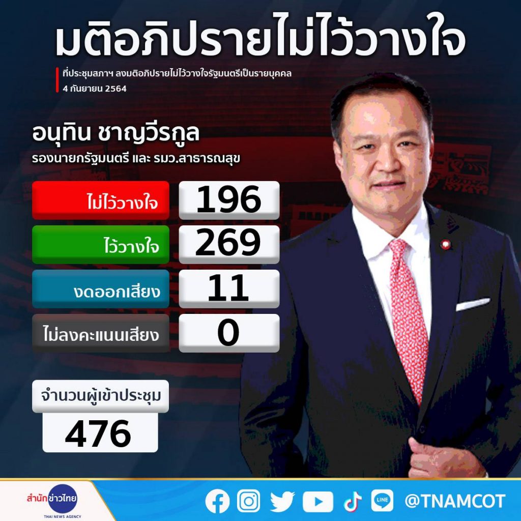 นายอนุทิน ชาญวีรกูล รองนายกรัฐมนตรีและรัฐมนตรีว่าการกระทรวงสาธารณสุข มีคะแนนไว้วางใจ 269 เสียง ไม่ไว้วางใจ 196 เสียง งดออกเสียง 11 เสียง