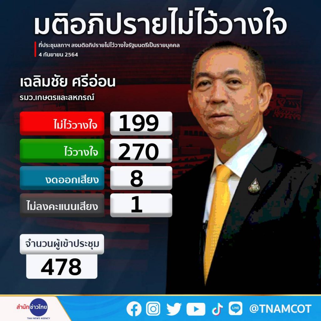 นายเฉลิมชัย ศรีอ่อน รัฐมนตรีว่าการกระทรวงเกษตรและสหกรณ์ มีคะแนนไว้วางใจ 270 เสียง ไม่ไว้วางใจ 199 เสียง งดออกเสียง 8 เสียง ไม่ลงคะแนน 1 เสียง