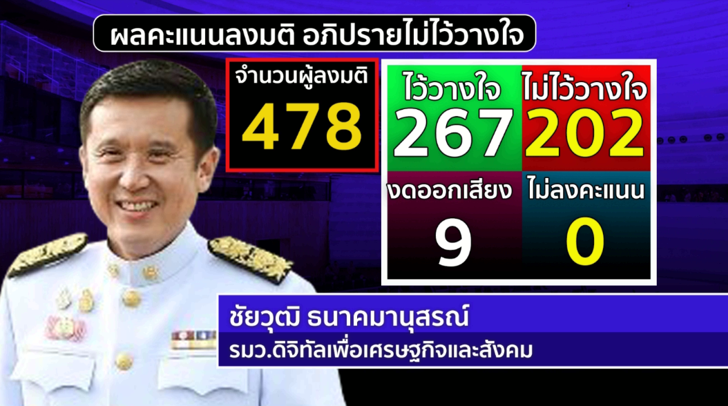 6. นายชัยวุฒิ ธนาคมานุสรณ์ รัฐมนตรีว่าการกระทรวงดิจิทัลเพื่อเศรษฐกิจและสังคม มีคะแนน ไว้วางใจ 267 เสียง ไม่ไว้วางใจ 202 เสียง งดออกเสียง 9 เสียง ถือว่านายกรัฐมนตรีและรัฐมนตรี รวม 6 คน ได้รับการไว้วางใจจากที่ประชุมสภาผู้แทนราษฎร