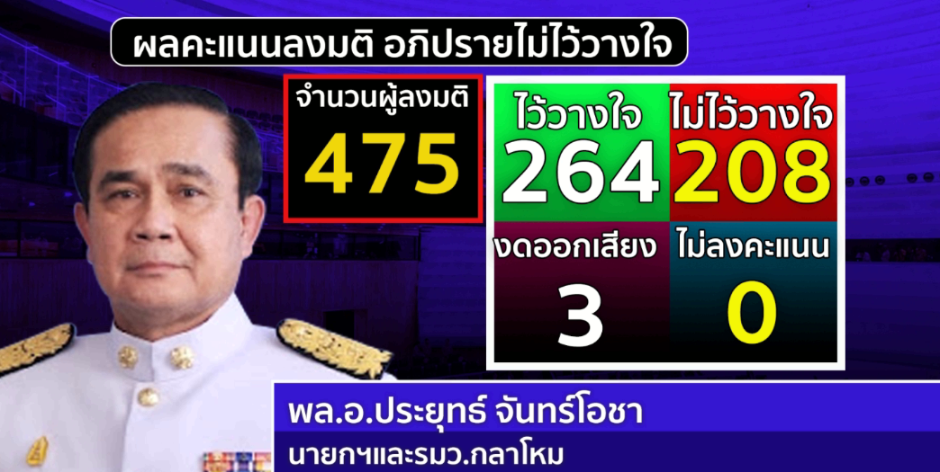 1. พล.อ.ประยุทธ์ จันทร์โอชา นายกรัฐมนตรีและรัฐมนตรีว่าการกระทรวงกลาโหม มีคะแนนไว้วางใจ 264 เสียง ไม่ไว้วางใจ 208 เสียง งดออกเสียง 3 เสียง