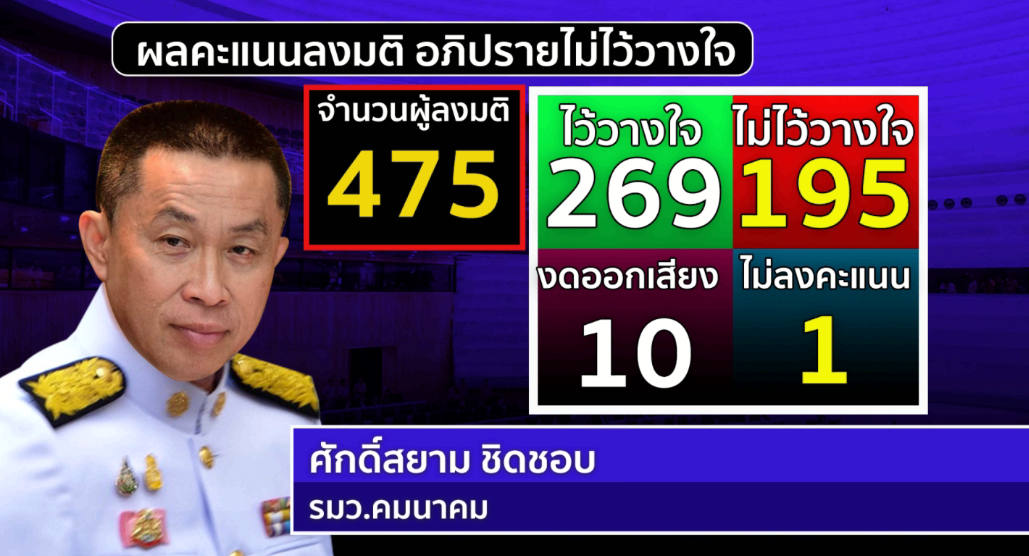 ที่ประชุมสภาผู้แทนราษฎรลงมติอภิปรายไม่ไว้วางใจรัฐมนตรีเป็นรายบุคคล ตามมาตรา 151 ปรากฏผลการลงคะแนนว่า