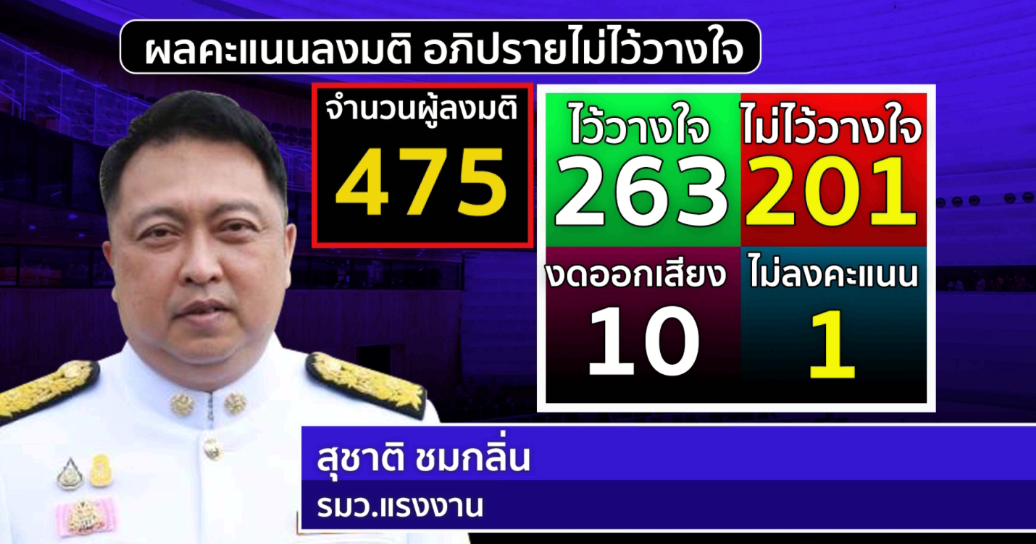 3. นายสุชาติ ชมกลิ่น รัฐมนตรีว่าการกระทรวงแรงงาน มีคะแนนไว้วางใจ 263 เสียง ไม่ไว้วางใจ 201 เสียง งดออกเสียง 10 เสียง ไม่ลงคะแนน 1 เสียง