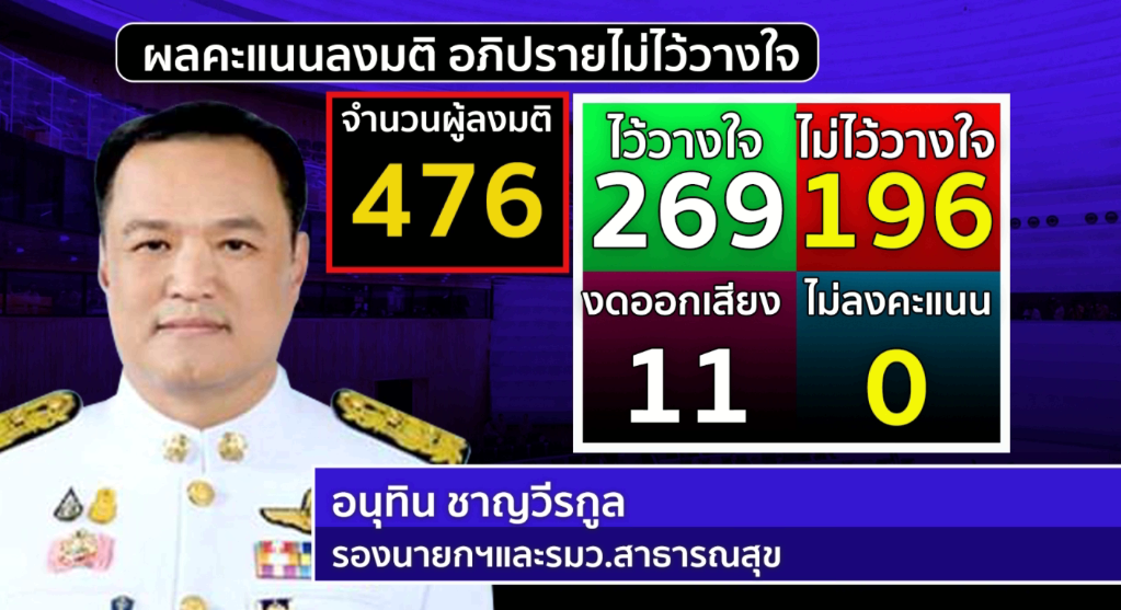 2. นายอนุทิน ชาญวีรกูล รองนายกรัฐมนตรีและรัฐมนตรีว่าการกระทรวงสาธารณสุข มีคะแนนไว้วางใจ 269 เสียง ไม่ไว้วางใจ 196 เสียง งดออกเสียง 11 เสียง